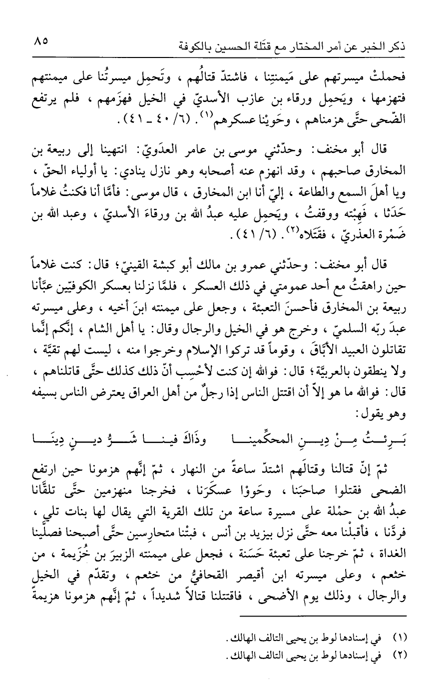ثمّ إنّ قتالنا وقتالَهم اشتدّ ساعةً من النهار، ثمّ إنَّهم هزمونا حين ارتفع الضحى فقتلوا صاحبَنا، وحَووْا عسكَرَنا، فخرجنا منهزمين حتَّى تلقَّانا عبدُ الله بن حمْلة على مسيرة ساعة من تلك القرية التي يقال لها بنات تلي، فردَّنا، فأقبلْنا معه حتَّى نزل بيزيد بن أنس، فبتْنا متحارِسين حتَّى أصبحنا فصلَّينا الغداة، ثمّ خرجنا على تعبئة حَسَنة، فجعل على ميمنته الزبيرَ بن خُزَيمة، من خثعم، وعلى ميسرته ابن أقيصر القحافيُّ من خثعم، وتقدّم في الخيل والرجال، وذلك يوم الأضحى، فاقتتلنا قتالًا شديدًا، ثمّ إنَّهم هزمونا هزيمةً