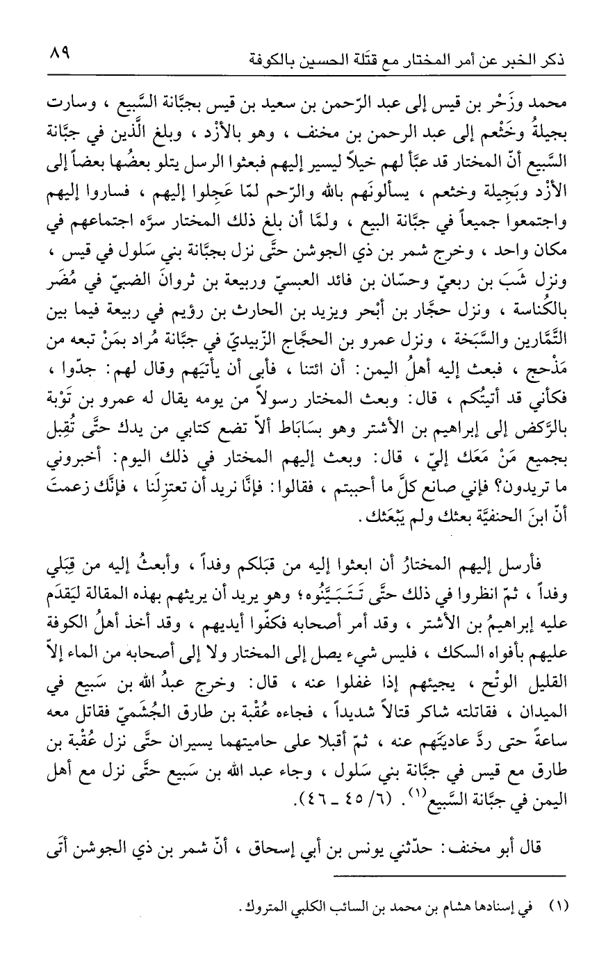 فأرسل إليهم المختارُ أن ابعثوا إليه من قبَلكم وفدًا، وأبعثُ إليه من قِبَلي وفدًا، ثمّ انظروا في ذلك حتَّى تَتَبَيَّنُوه؛ وهو يريد أن يريثهم بهذه المقالة ليَقدَم عليه إبراهيمُ بن الأشتر، وقد أمر أصحابه فكفّوا أيديهم، وقد أخذ أهلُ الكوفة عليهم بأفواه السكك، فليس شيء يصل إلى المختار ولا إلى أصحابه من الماء إلّا القليل الوتْح، يجيئهم إذا غفلوا عنه، قال: وخرج عبدُ الله بن سَبيع في الميدان، فقاتلته شاكر قتالًا شديدًا، فجاءه عُقْبة بن طارق الجُشَميّ فقاتل معه ساعة حتى ردَّ عاديَتَهم عنه، ثمّ أقبلا على حاميتهما يسيران حتَّى نزل عُقبة بن طارق مع قيس في جبَّانة بني سَلول، وجاء عبد الله بن سَبيع حتَّى نزل مع أهل اليمن في جبَّانة السَّبيع (١). (٦/ ٤٥ - ٤٦).