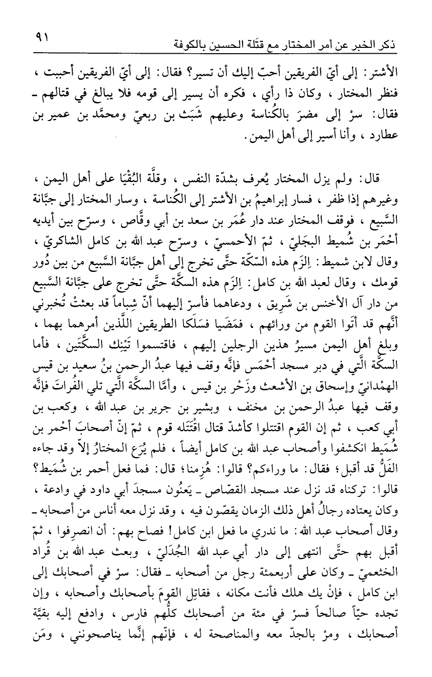 الأشتر: إلى أيّ الفريقين أحبّ إليك أن تسير؟ فقال: إلى أيّ الفريقين أحببت، فنظر المختار، وكان ذا رأي، فكره أن يسير إلى قومه فلا يبالغ في قتالهم - فقال: سرْ إلى مضرَ بالكُناسة وعليهم شَبَث بن ربعيّ ومحمَّد بن عمير بن عطارد، وأنا أسير إلى أهل اليمن.