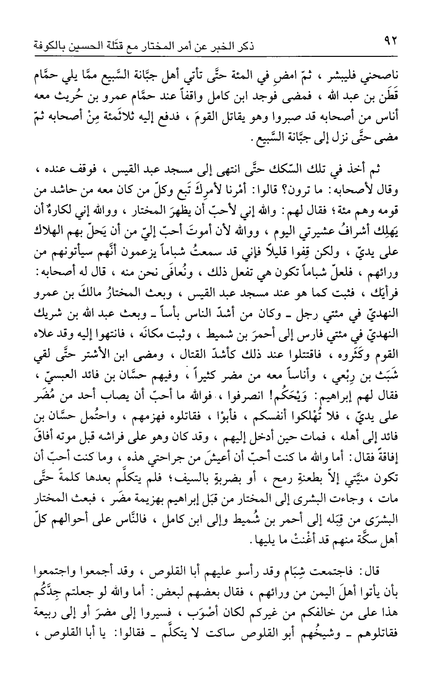 ثم أخذ في تلك السّكك حتَّى انتهى إلى مسجد عبد القيس، فوقف عنده، وقال لأصحابه: ما ترون؟ قالوا: أمْرنا لأمرِكَ تَبع وكلّ من كان معه من حاشد من قومه وهم مئة؛ فقال لهم: والله إني لأحبّ أن يظهرَ المختار، ووالله إني لكارهٌ أن يَهلِك أشرافُ عشيرتي اليوم، ووالله لأن أموتَ أحبّ إليّ من أن يَحلّ بهم الهلاك على يديّ، ولكن قِفوا قليلًا فإني قد سمعتُ شبامًا يزعمون أنَّهم سيأتونهم من ورائهم، فلعلّ شبامًا تكون هي تفعل ذلك، ونُعافَى نحن منه، قال له أصحابه: فرأيَك، فثبت كما هو عند مسجد عبد القيس، وبعث المختارُ مالكَ بن عمرو النهدىّ في مئتي رجل - وكان من أشدّ الناس بأسًا - وبعث عبد الله بن شريك النهديّ في مئتي فارس إلى أحمرَ بن شميط، وثبت مكانَه، فانتهوا إليه وقد علاه القوم وكَثَروه، فاقتتلوا عند ذلك كأشدّ القتال، ومضى ابن الأشتر حتَّى لقي شَبَث بن رِبْعي، وأناسًا معه من مضر كثيرًا، وفيهم حسَّان بن فائد العبسيّ، فقال لهم إبراهيم: وَيْحَكُم! انصرفوا، فوالله ما أحبّ أن يصاب أحد من مُضَر على يديّ، فلا تُهْلكوا أنفسكم، فأبوْا، فقاتلوه فهزمهم، واحتُمل حسَّان بن فائد إلى أهله، فمات حين أدخل إليهم، وقد كان وهو على فراشه قبل موته أفاقَ إفاقةً فقال: أما والله ما كنت أحبّ أن أعيشَ من جراحتي هذه، وما كنت أحبّ أن تكون منيَّتي إلّا بطعنةِ رمح، أو بضربةٍ بالسيف؛ فلم يتكلَّمِ بعدها كلمةً حتَّى مات، وجاءت البشرى إلى المختار من قبَل إبراهيم بهزيمة مضَر، فبعث المختار البشرَى من قِبَله إلى أحمر بن شُميط وإلى ابن كامل، فالنَّاس على أحوالهم كلّ أهل سكَّة منهم قد أغْنتْ ما يليها.