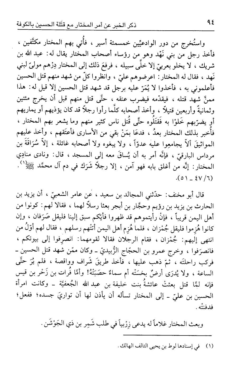 واستُخرج من دور الوادعيِّين خمسمئة أسير، فأُتي بهم المختار مكتَّفين، فأخذ رجل من بني نَهْد وهو من رؤساء أصحاب المختار يقال له: عبد الله بن شريك، لا يخلو بعربيّ إلا خلَّى سبيله، فرفعَ ذلك إلى المختار دِرْهم مولىً لبني نَهد، فقال له المختار: اعرضوهم عليّ، وانظروا كلّ من شهد منهم قتل الحسين فأعلموني به، فأخذوا لا يُمَرّ عليه برجل قد شهد قتل الحسين إلا قيل له: هذا ممَّن شهد قتله، فيقدّمه فيضرب عنقه، حتَّى قتل منهم قبل أن يخرج مئتين وثمانيةً وأربعين قتيلًا، وأخذ أصحابه كلَّما رأوا رجلًا قد كان يؤذيهم أو يماريهم أو يضرّبهم خَلوْا به فَقتَلُوه حتَّى قُتل ناس كثير منهم وما يشعر بهم المختار، فأُخبر بذلك المختار بعدُ، فدعَا بمَنْ بقي من الأسارى فأعتَقهم، وأخذ عليهم المواثيقَ ألّا يجامعوا عليه عدوًّا، ولا يبغوه ولا أصحابه غائلة، إلّا سُرَاقَةَ بن مرداس البارقيّ، فإنَّه أمر به أن يُساقَ معه إلى المسجد، قال: ونادى منادِي المختار: إنَّه من أغلق بابه فهو آمن، إلا رجلًا شَرَك في دم آل محمَّد - صلى الله عليه وسلم - (١). (٦/ ٤٧ - ٥١).