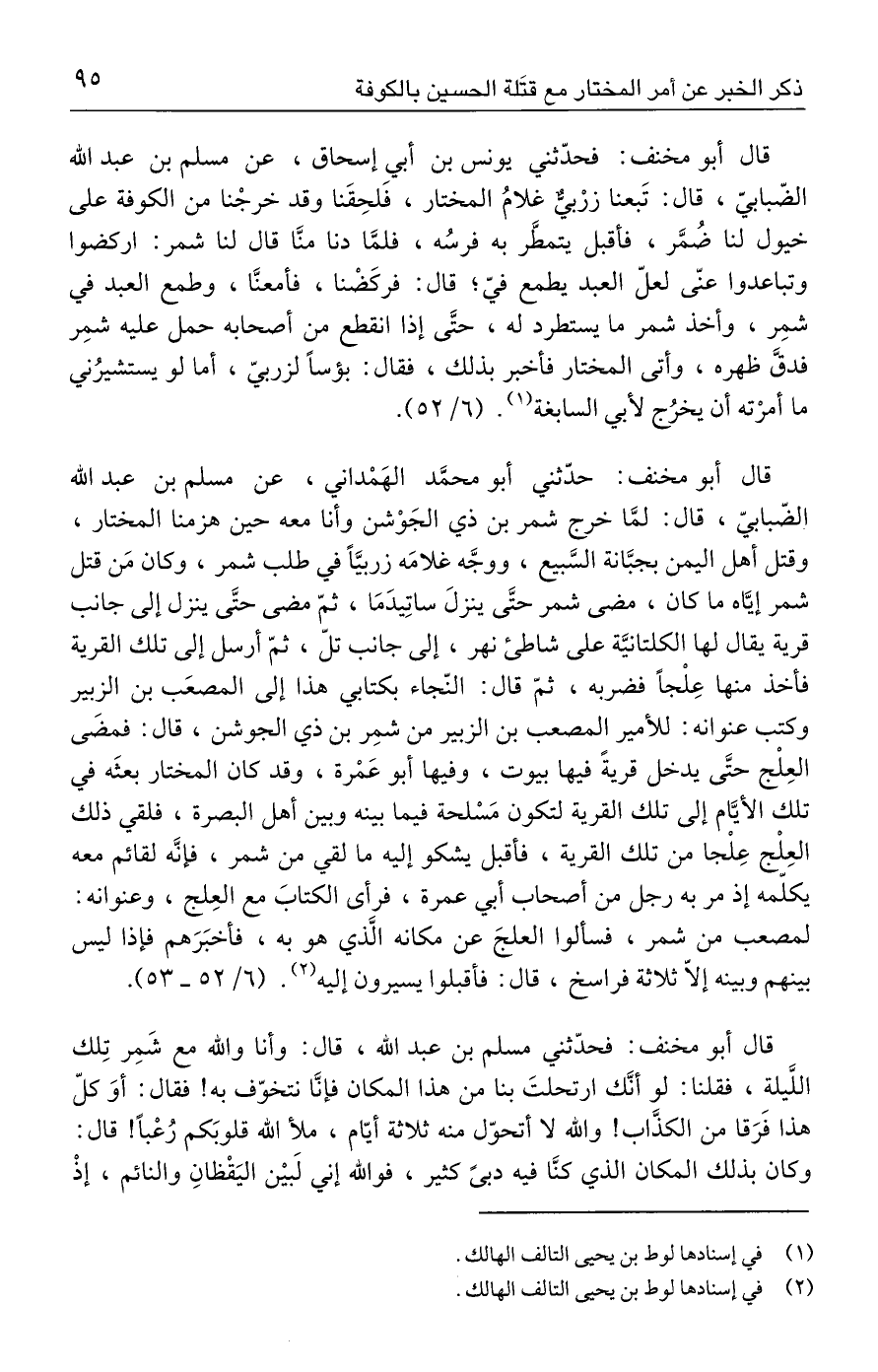 قال أبو مخنف: حدّثني أبو محمَّد الهَمْداني، عن مسلم بن عبد الله الضّبابيّ، قال: لمَّا خرج شمر بن ذي الجَوْشن وأنا معه حين هزمنا المختار، وقتل أهل اليمن بجبَّانة السَّبيع، ووجَّه غلامَه زربيًّا في طلب شمر، وكان مَن قتل شمر إيَّاه ما كان، مضى شمر حتَّى ينزلَ ساتِيدَمَا، ثمّ مضى حتَّى ينزل إلى جانب قرية يقال لها الكلتانيَّة على شاطئ نهر، إلى جانب تلّ، ثمّ أرسل إلى تلك القرية فأخذ منها عِلْجًا فضربه، ثمّ قال: النّجاء بكتابي هذا إلى المصعَب بن الزبير وكتب عنوانه: للأمير المصعب بن الزبير من شمِر بن ذي الجوشن، قال: فمضَى العِلْج حتَّى يدخل قريةً فيها بيوت، وفيها أبو عَمْرة، وقد كان المختار بعثَه في تلك الأيَّام إلى تلك القرية لتكون مَسْلحة فيما بينه وبين أهل البصرة، فلقي ذلك العِلْج عِلْجا من تلك القرية، فأقبل يشكو إليه ما لقي من شمر، فإنَّه لقائم معه يكلّمه إذ مر به رجل من أصحاب أبي عمرة، فرأى الكتابَ مع العِلج، وعنوانه: لمصعب من شمر، فسألوا العلجَ عن مكانه الَّذي هو به، فأخبَرَهم فإذا ليس بينهم وبينه إلّا ثلائة فراسخ، قال: فأقبلوا يسيرون إليه (٢). (٦/ ٥٢ - ٥٣).