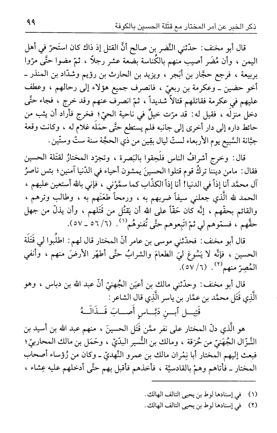قال أبو مخنف: فحدّثني موسى بن عامر أنّ المختار قال لهم: اطلُبوا لي قَتَلَة الحسين، فإنَّه لا يَسُوغ ليَ الطعام والشرابُ حتَّى أطهّر الأرضَ منهم، وأنفي المُصِرّ منهم (٢). (٦/ ٥٧).