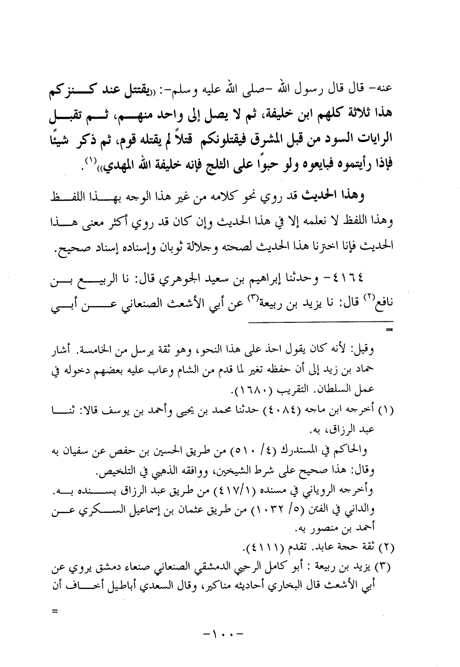 4163- حَدَّثنا أحمد بن منصور، قَال: حَدَّثنا عَبد الرَّزَّاق قال أَخْبَرَنَا الثَّورِيّ، عَن خَالِدٍ الحَذَّاء، عَن أَبِي قِلاَبَةَ عَنْ أَبِي أَسْمَاءَ عَنْ ثَوْبَانَ، رَضِي اللَّهُ عَنْهُ، قَالَ قَالَ رَسُول اللهِ صَلَّى اللَّهُ عَلَيه وَسَلَّم: يُقْتَتَلُ عِنْدَ كَنْزِكُمْ هَذَا ثَلاثَةٌ كُلُّهُمُ ابْنُ خَلِيفَةٍ، ثُمَّ لا يَصِلُ إِلَى وَاحِدٍ مِنْهُمْ، ثُمَّ تُقْبِلُ الرَّايَاتُ السُّودُ مِنْ قِبَلِ الْمَشْرِقِ فَيَقْتُلُونَكُمْ قَتْلا لَمْ يَقْتُلْهُ قَوْمٌ، ثُمَّ ذَكَرَ شَيْئًا فَإِذَا رَأَيْتُمُوهُ فَبَايِعُوهُ، وَلَوْ حَبْوًا عَلَى الثَّلْجِ فَإِنَّهُ خَلِيفَةُ اللَّهِ الْمَهْدِيُّ.
