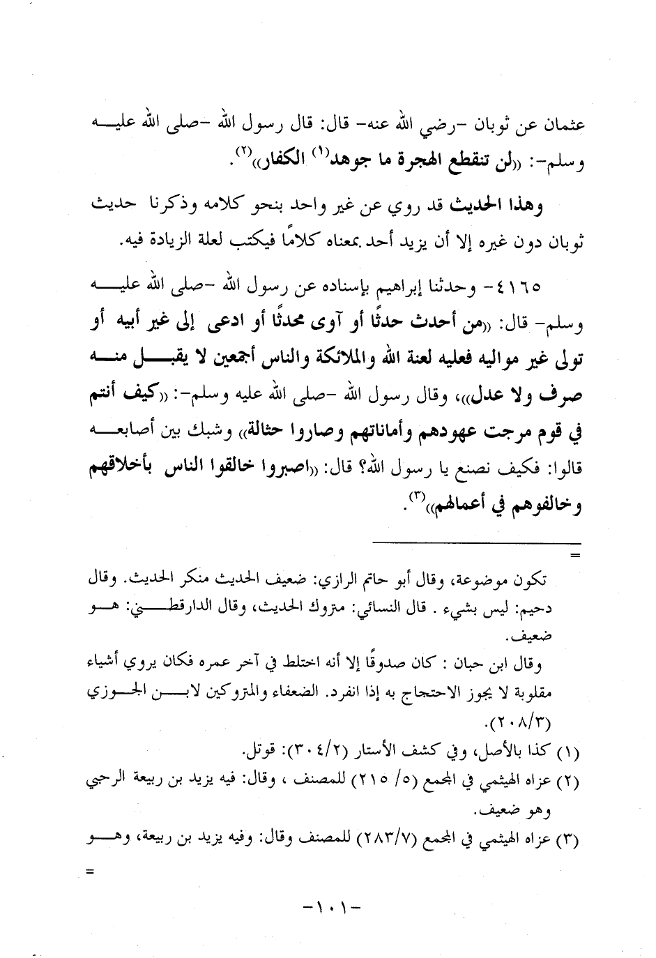 4164- وحَدَّثنا إبراهيم بن سَعِيد الجوهري، قَال: حَدَّثنا الربيع بن نافع، قَال: حَدَّثنا يَزِيدُ بْنُ رَبِيعَةَ، عَن أَبِي الأَشْعَثِ الصَّنْعَانِيِّ، عَن أَبِي عُثمان، عَن ثَوْبَانَ، رَضِي اللَّهُ عَنْهُ، قَالَ: قَالَ رَسُول اللهِ صَلَّى اللَّهُ عَلَيه وَسَلَّم: لَنْ تَنْقَطِعَ الْهِجْرَةُ مَا جُوهِدَ الْكُفَّارُ.