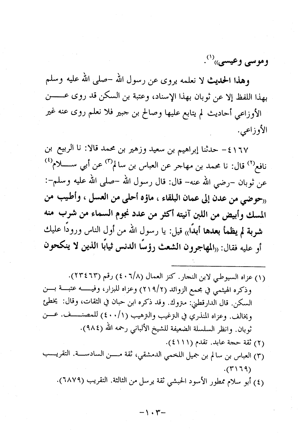 وَهَذَا الْحَدِيثُ لا نَعْلَمُهُ يُرْوَى عَن رَسُولِ اللَّهِ صَلَّى اللَّهُ عَلَيه وَسَلَّم بِهَذَا اللَّفْظِ إلاَّ عَنْ ثَوْبَانَ بِهَذَا الإِسْنَادِ وَعُتْبَةُ بْنُ السَّكَنِ قَدْ رَوَى عَن الأَوْزاعِيّ أَحَادِيثَ لَمْ يُتَابَعْ عَلَيْهَا، وَصَالِحُ بْنُ جُبَير فَلا نَعْلَمُ رَوَى عَنْهُ غَيْرُ الأَوْزَاعِيِّ.