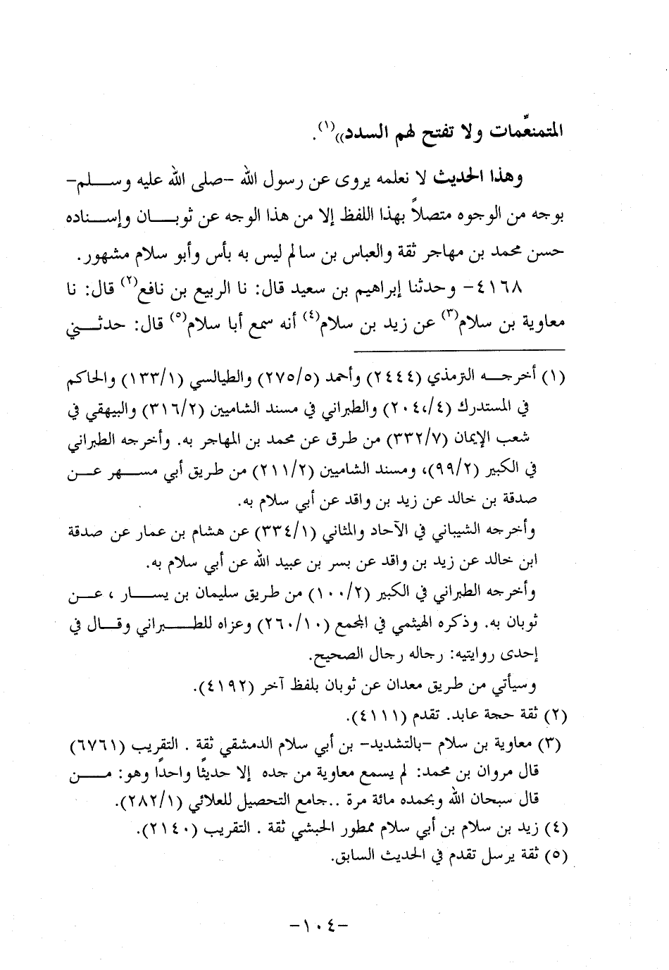 4167- حَدَّثنا إِبْرَاهِيمُ بْنُ سَعِيد وَزُهَيْرُ بْنُ مُحَمد، قَالاَ: حَدَّثنَا الربيع بن نافع، قَال: حَدَّثنا مُحَمد بْنُ مُهَاجِرٍ عَنِ الْعَبَّاسِ بْنِ سَالِمٍ، عَن أَبِي سَلامٍ عَنْ ثَوْبَانَ، رَضِي اللَّهُ عَنْهُ، قَالَ: قَالَ رَسُول اللهِ صَلَّى اللَّهُ عَلَيه وَسَلَّم: حَوْضِي مِنْ عَدَنَ إِلَى عَمَّانَ الْبَلْقَاءِ، مَاؤُهُ أَحْلَى مِنَ الْعَسَلِ وَأَطْيَبُ مِنَ الْمِسْكِ وَأَبْيَضُ مِنَ اللَّبَنِ آنِيَتُهُ أَكْثَرُ مِنْ عَدَدِ نُجُومِ السَّمَاءِ مَنْ شَرِبَ مِنْهُ شَرْبَةً لَمْ يَظْمَأْ بَعْدَهَا أَبَدًا قِيلَ: يَا رَسولَ اللهِ مَنْ أَوَّلُ النَّاسِ وُرُودًا عَلَيْكَ، أَوْ عليه فقال: المهاجرون الشعث رؤسا الدنس ثيابا الذين لا ينكحون المتمنعمات، ولاَ تُفْتَحُ لَهُمُ السُّدَدُ.
