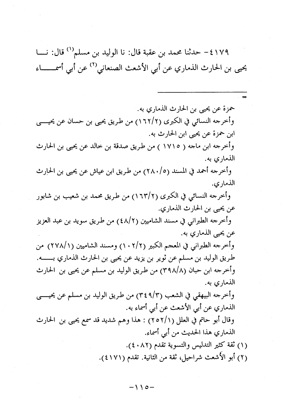 4179- حَدَّثنا مُحَمد بن عقبة، قَال: حَدَّثنا الوليد بن مسلم، قَال: حَدَّثنا يَحْيَى بْنُ الْحَارِثِ الذِّمَارِيُّ، عَن أَبِي الأَشْعَثِ الصَّنْعَانِيِّ، عَن أَبِي أَسْمَاءَ الرَّحَبِيِّ عَنْ ثَوبان، عَن النَّبِيّ صَلَّى اللَّهُ عَلَيه وَسَلَّم، بِنَحْوِهِ.