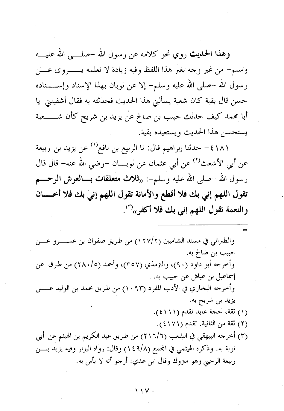 4181- حَدَّثنا إبراهيم، قَال: حَدَّثنا الرَّبِيعُ بْنُ نَافِعٍ عَنْ يَزِيدَ بْنِ رَبِيعَةَ، عَن أَبِي الأَشْعَثِ، عَن أَبِي عُثمان، عَن ثَوْبَانَ، رَضِي اللَّهُ عَنْهُ، قَالَ قَالَ رَسُول اللهِ صَلَّى اللَّهُ عَلَيه وَسَلَّم: ثَلاثٌ مُتَعَلِّقَاتٌ بالعرش الرحم تقول اللهم إِنِّي بِكَ فَلا أُقْطَعُ وَالأَمَانَةُ تَقُولُ اللَّهُمَّ إِنِّي بِكَ فَلا أُخَانُ وَالنِّعْمَةُ تَقُولُ اللَّهُمَّ إِنِّي بِكَ فَلا أُكْفَرُ.