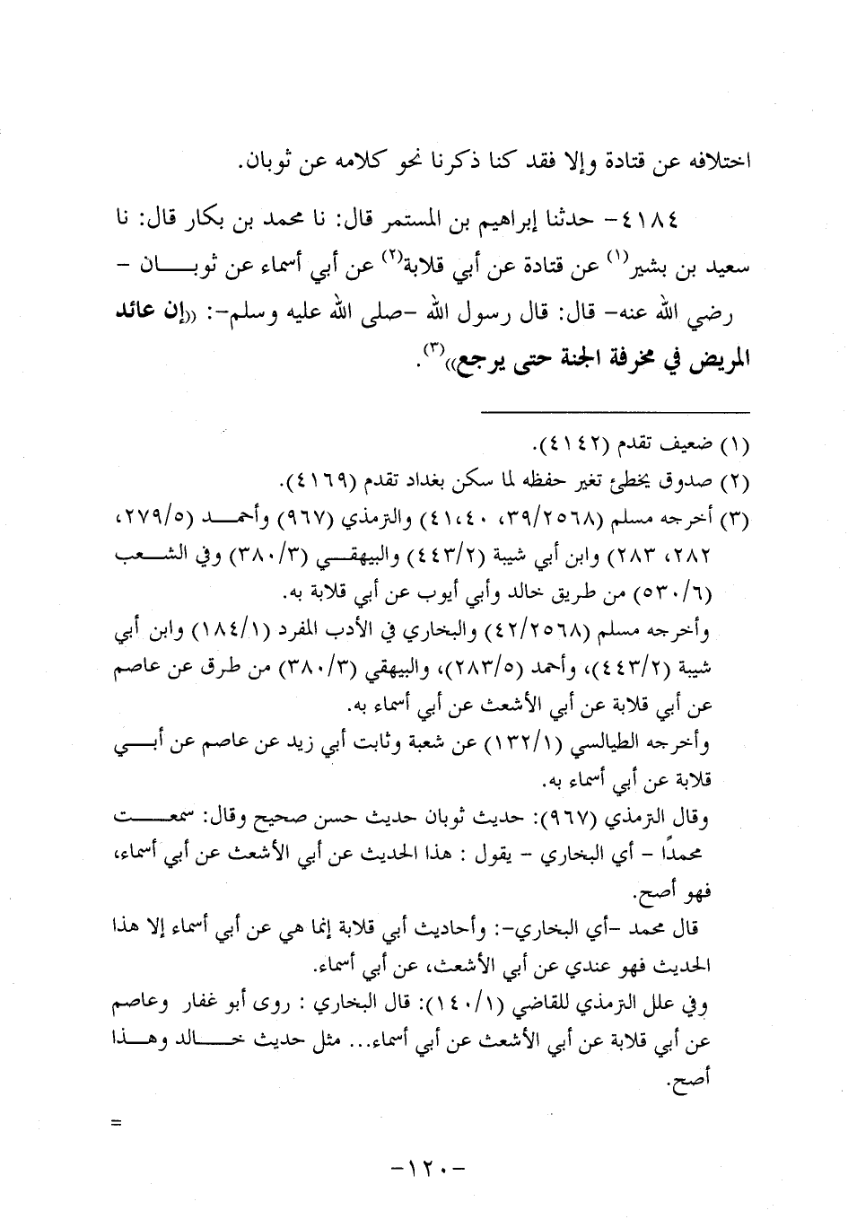 4184- حَدَّثنا إبراهيم بن المستمر، قَال: حَدَّثنا مُحَمد بن بكار، قَال: حَدَّثنا سَعِيد بْنُ بَشِيرٍ، عَنْ قَتَادَةَ، عَن أَبِي قِلاَبَةَ، عَن أَبِي أَسْمَاءَ عَنْ ثَوْبَانَ، رَضِي اللَّهُ عَنْهُ، قَالَ: قَالَ رَسُول اللهِ صَلَّى اللَّهُ عَلَيه وَسَلَّم: إِنَّ عَائِدَ الْمَرِيضِ فِي مَخْرَفَةِ الْجَنَّةِ حَتَّى يَرْجِعَ.