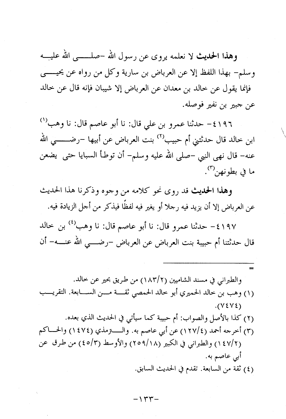 4196- حَدَّثنا عَمْرو بن علي، قَال: حَدَّثنا أَبُو عَاصِم، قَال: حَدَّثنا وهب بن خالد قال حدثتني أم حبيب بِنْتُ الْعِرْبَاضِ عَنْ أَبِيهَا، رَضِي اللَّهُ عَنْهُ، قَالَ نَهَى النَّبِيّ صَلَّى اللَّهُ عَلَيه وَسَلَّم أَنْ تُوطَأَ السَّبَايَا حَتَّى يَضَعْنَ مَا فِي بُطُونِهِنَّ.