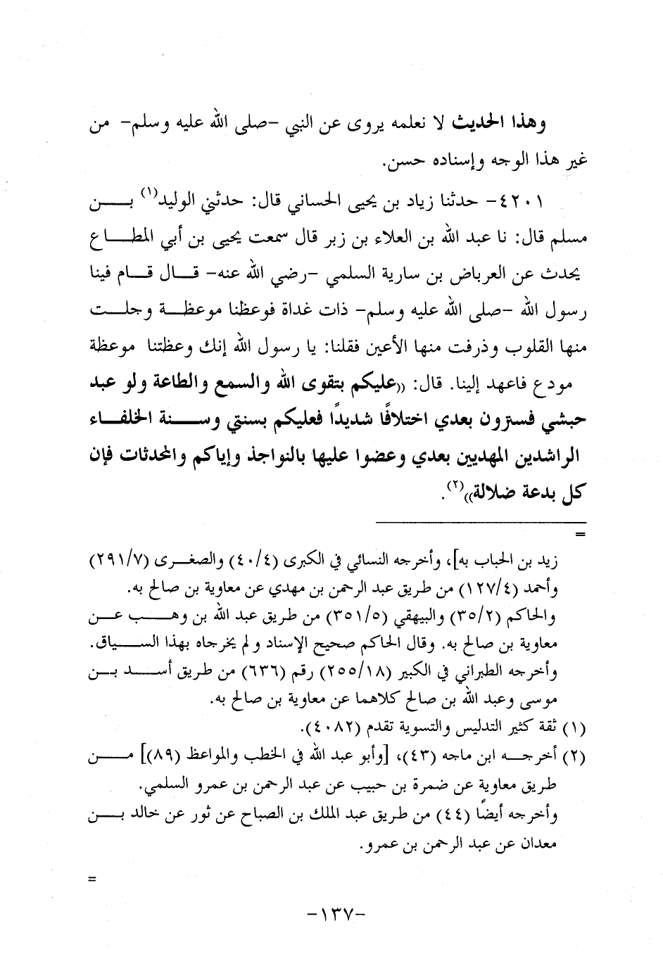 4201- حَدَّثنا زِيَادُ بْنُ يَحْيَى الْحَسَّانِيُّ، قَالَ: حَدَّثني الوليد بن مسلم، قَال: حَدَّثنا عَبد اللَّهِ بْنُ الْعَلاءِ بْنِ زَبْرٍ، قَال: سَمعتُ يَحْيَى بْنَ أَبِي الْمُطَاعِ يُحَدِّثُ عَنِ الْعِرْبَاضِ بْنِ سَارِيَةَ السُّلَمِيِّ، رَضِي اللَّهُ عَنْهُ، قَالَ قَامَ فِينَا رَسُولُ اللَّهِ صَلَّى اللَّهُ عَلَيه وَسَلَّم ذَاتَ غَدَاةٍ فَوَعَظَنَا مَوْعِظَةً وَجِلَتْ منها القلوب وذرفت منها الأعين فَقُلْنَا: يَا رَسولَ اللهِ إِنَّكَ وَعَظْتَنَا مَوْعِظَةَ مُوَدِّعٍ فَاعْهَدْ إِلَيْنَا قَالَ: عَلَيْكُمْ بِتَقْوَى اللَّهِ والسمع والطاعة، ولو عَبد حبشي فَسَتَرَوْنَ بَعْدِي اخْتِلافًا شَدِيدًا فَعَلَيْكُمْ بِسُنَّتِي وَسُنَّةِ الْخُلَفَاءِ الرَّاشِدِينَ الْمَهْدِيِّينَ بَعْدِي وَعَضُّوا عَلَيْهَا بِالنَّوَاجِذِ وَإِيَّاكُمْ وَالْمُحْدِثَاتِ فَإِنَّ كُلَّ بِدْعَةٍ ضَلالَةٌ.