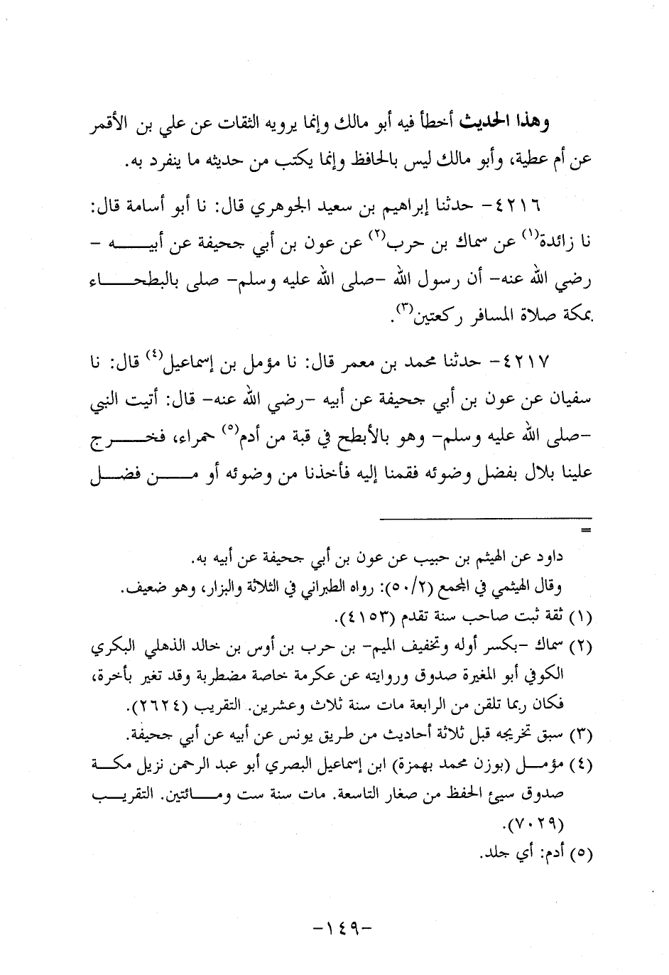 4216- حَدَّثنا إبراهيم بن سَعِيد الجوهري، قَال: حَدَّثنا أَبُو أُسَامة، قَال: حَدَّثنا زَائِدَةُ عَنْ سِمَاك بْنِ حَرْبٍ عَنْ عَوْنِ بْنِ أَبِي جُحْيَفَةَ، عَن أَبيهِ، رَضِي اللَّهُ عَنْهُ، أَنَّ رَسُولَ اللهِ صَلَّى اللَّهُ عَلَيه وَسَلَّم صَلَّى بِالْبَطْحَاءِ بِمَكَّةَ صَلاةَ الْمُسَافِرِ رَكْعَتَيْنِ.
