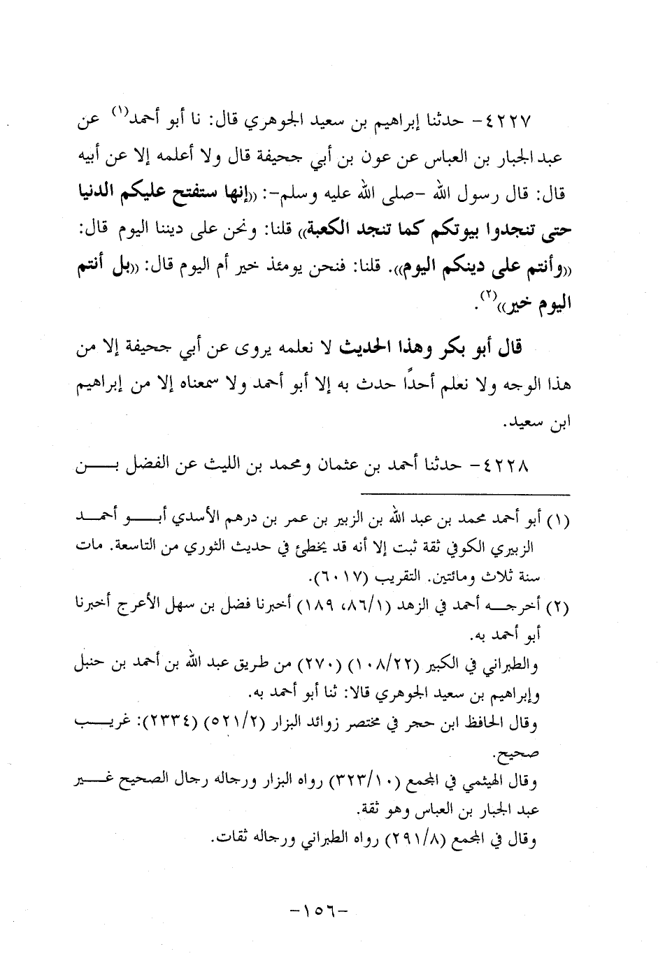 4227- حَدَّثنا إبراهيم بن سَعِيد الجوهري، قَال: حَدَّثنا أَبُو أَحْمَدَ عَنْ عَبد الْجَبَّارِ بْنِ الْعَبَّاسِ عَنْ عَوْنِ بْنِ أَبِي جُحَيْفَةَ قَالَ، ولاَ أَعْلَمُهُ إلاَّ، عَن أَبيهِ قَالَ: قَالَ رَسُول اللهِ صَلَّى اللَّهُ عَلَيه وَسَلَّم: إِنَّهَا سَتُفْتَحُ عَلَيْكُمُ الدُّنْيَا حَتَّى تُنَجِّدُوا بُيُوتَكُمْ كَمَا تُنَجَّدُ الْكَعْبَةُ قُلْنَا: وَنَحْنُ عَلَى دِينِنَا الْيَوْمَ قَالَ: وَأَنْتُمْ عَلَى دِينِكُمُ الْيَوْمَ. قُلْنَا: فَنَحْنُ يَوْمَئِذٍ خَيْرٌ أَمِ الْيَوْمَ قَالَ: بَلْ أَنْتُمُ الْيَوْمَ خَيْرٌ.