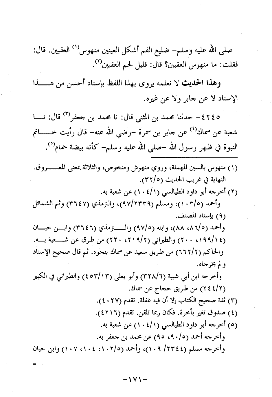 4245- حَدَّثنا مُحَمَّدُ بْنَ الْمُثَنَّى، قَال: حَدَّثنا مُحَمَّدُ بْنَ جَعْفَرٍ، قَال: حَدَّثنا شُعْبَةُ، عَن سِمَاك عَنْ جَابِرِ بْنِ سَمُرة، رَضِي اللَّهُ عَنْهُ، قَالَ رَأَيْتُ خَاتَمَ النُّبُوَّةِ فِي ظَهْرِ رَسُولِ اللَّهِ صَلَّى اللَّهُ عَلَيه وَسَلَّم كَأَنَّهُ بَيْضَةُ حَمَامٍ.
