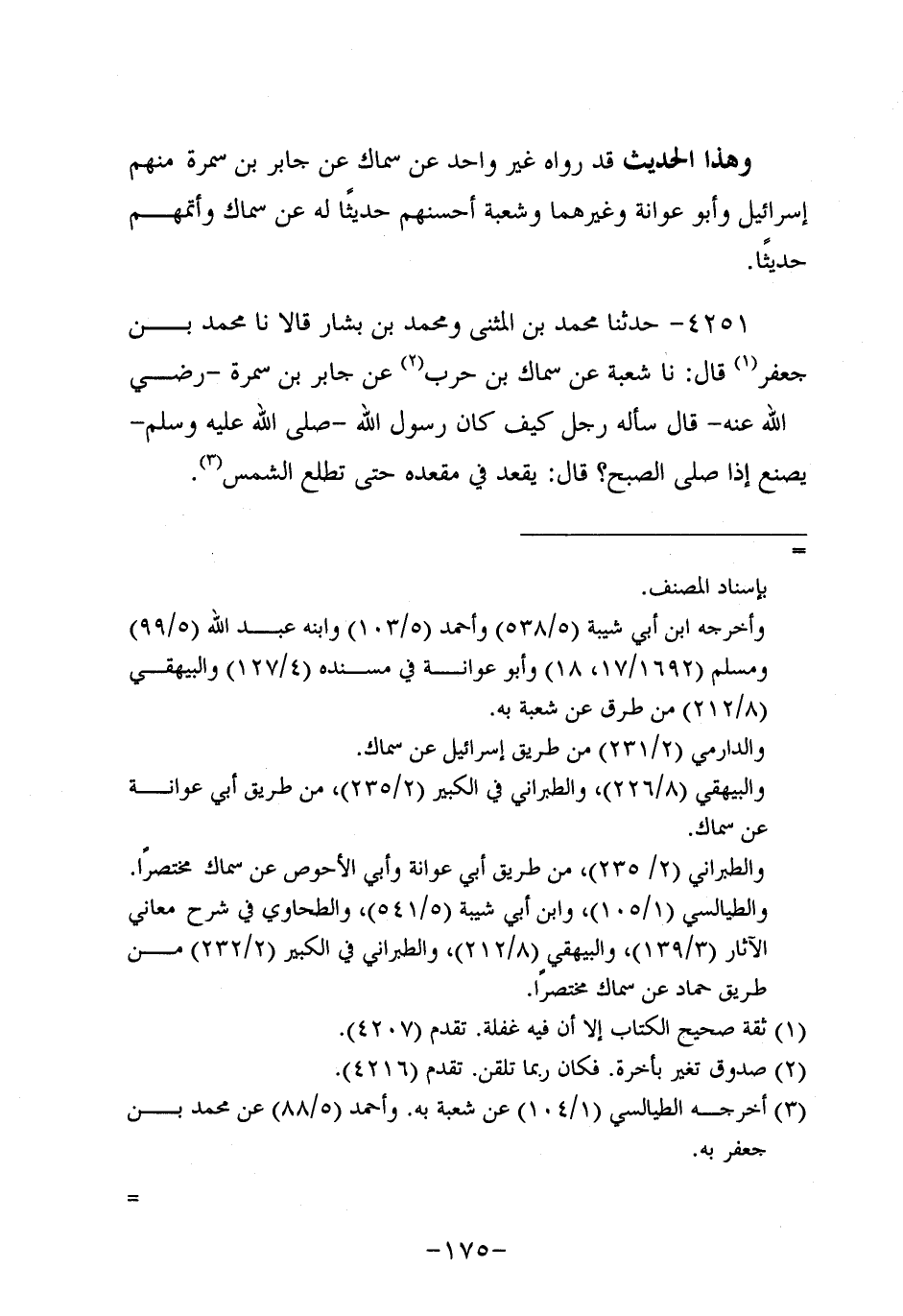 4251- حَدَّثنا مُحَمَّدُ بْنَ الْمُثَنَّى، ومُحَمَّد بْنُ بَشَّار، قَالاَ: حَدَّثنَا مُحَمَّدُ بْنَ جَعْفَرٍ، قَال: حَدَّثنا شُعْبَةُ، عَن سِمَاك بْنِ حَرْبٍ عَنْ جَابِرِ بْنِ سَمُرة، رَضِي اللَّهُ عَنْهُ، قَالَ سَأَلَهُ رَجُلٌ كَيْفَ كَانَ رَسُولُ اللَّهِ صَلَّى اللَّهُ عَلَيه وَسَلَّم يَصْنَعُ إِذَا صَلَّى الصُّبْحَ؟ قَالَ: يَقْعُدُ فِي مَقْعَدِهِ حَتَّى تَطْلُعَ الشَّمْسُ.