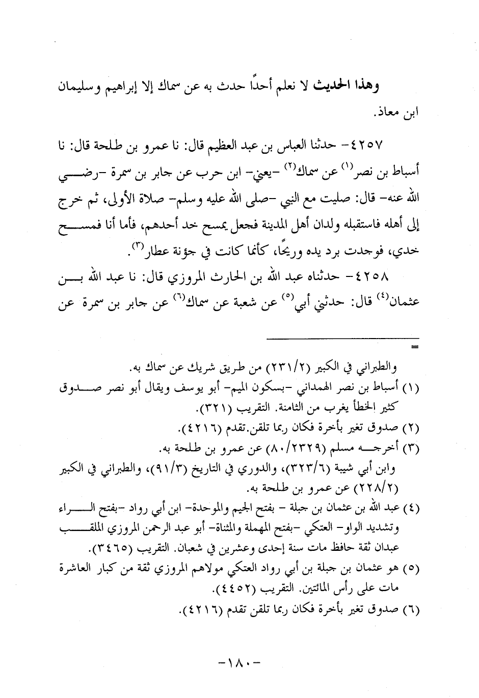 وَهَذَا الْحَدِيثُ لا نعلَمُ أحَدًا حَدَّثَ بِهِ عَنْ شُعْبَةَ إلاَّ عُثمَان بْنُ جَبَلَةَ، ولاَ نَعْلَمُ حدث به غَيْرِ شُعْبَةَ إلاَّ أَسْبَاطُ بْنُ نَصْرٍ.