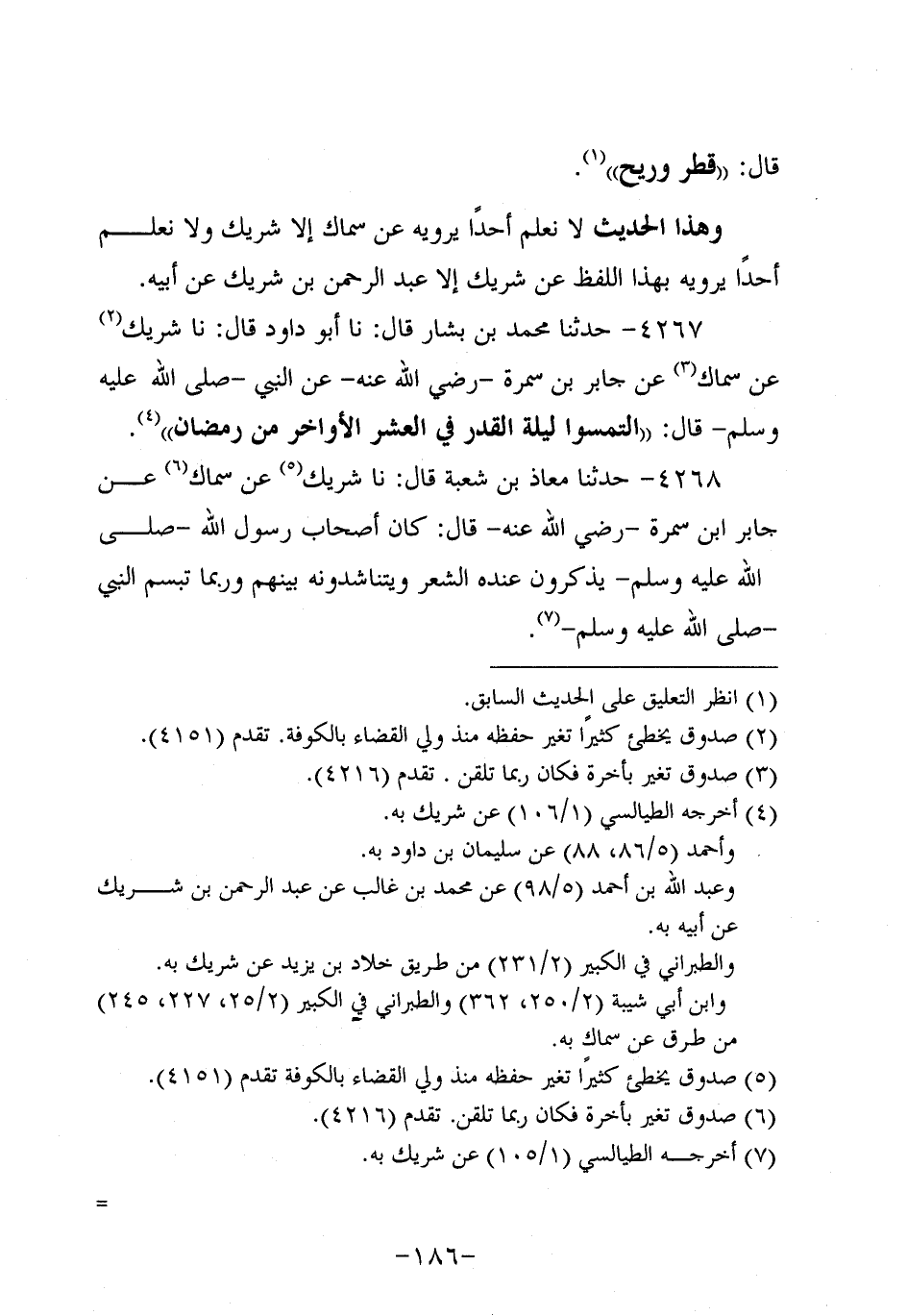 4267- حَدَّثنا مُحَمد بن بَشَّار، قَال: حَدَّثنا أَبُو داود، قَال: حَدَّثنا شَرِيكٌ عَنْ سِمَاك عَنْ جَابِرِ بْنِ سَمُرة، رَضِي اللَّهُ عَنْهُ، عَنِ النَّبِيّ صَلَّى اللَّهُ عَلَيه وَسَلَّم قَالَ: الْتَمِسُوا لَيْلَةَ الْقَدْرِ فِي الْعَشْرِ الأَوَاخِرِ مِنْ رَمَضَانَ.