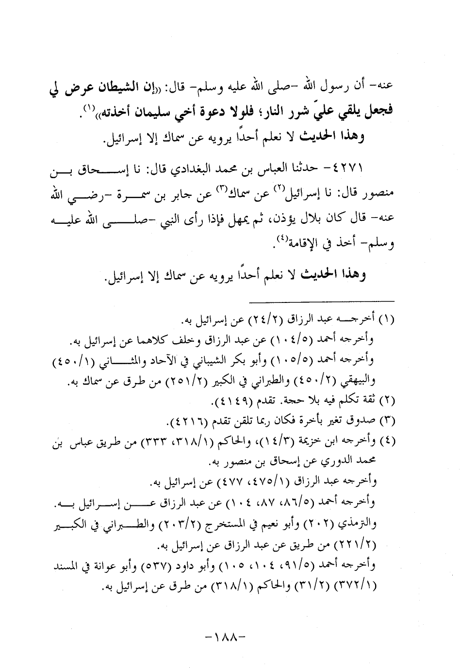 4271- حَدَّثنا العباس بن مُحَمد البغدادي، قَال: حَدَّثنا إسحاق بن منصور، قَال: حَدَّثنا إِسْرَائِيلُ، عَن سِمَاك عَنْ جَابِرِ بْنِ سَمُرة، رَضِي اللَّهُ عَنْهُ، قَالَ: كَانَ بِلالٌ يُؤَذِّنُ، ثُمَّ يُمْهِلُ فَإِذَا رَأَى النَّبِيّ صَلَّى اللَّهُ عَلَيه وَسَلَّم أَخَذَ فِي الإِقَامَةِ.