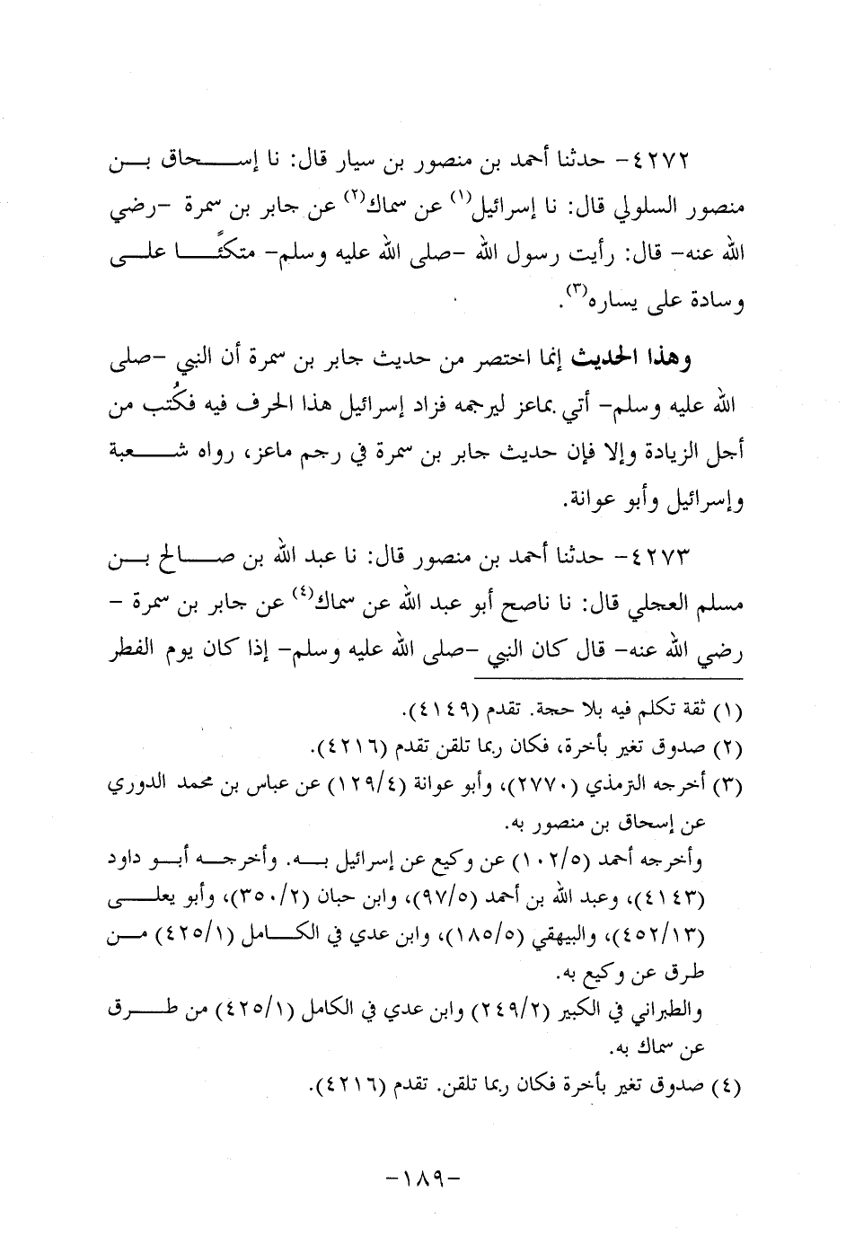 4272- حَدَّثنا أَحْمَدُ بْنُ مَنْصُورِ بْنِ سَيَّارٍ، قَال: حَدَّثنا إسحاق بن منصور السلولي، قَال: حَدَّثنا إِسْرَائِيلُ، عَن سِمَاك عَنْ جَابِرِ بْنِ سَمُرة، رَضِي اللَّهُ عَنْهُ، قَالَ: رَأَيْتُ رَسُولَ اللَّهِ صَلَّى اللَّهُ عَلَيه وَسَلَّم مُتَّكِئًا عَلَى وِسَادَةٍ عَلَى يَسَارِهِ.