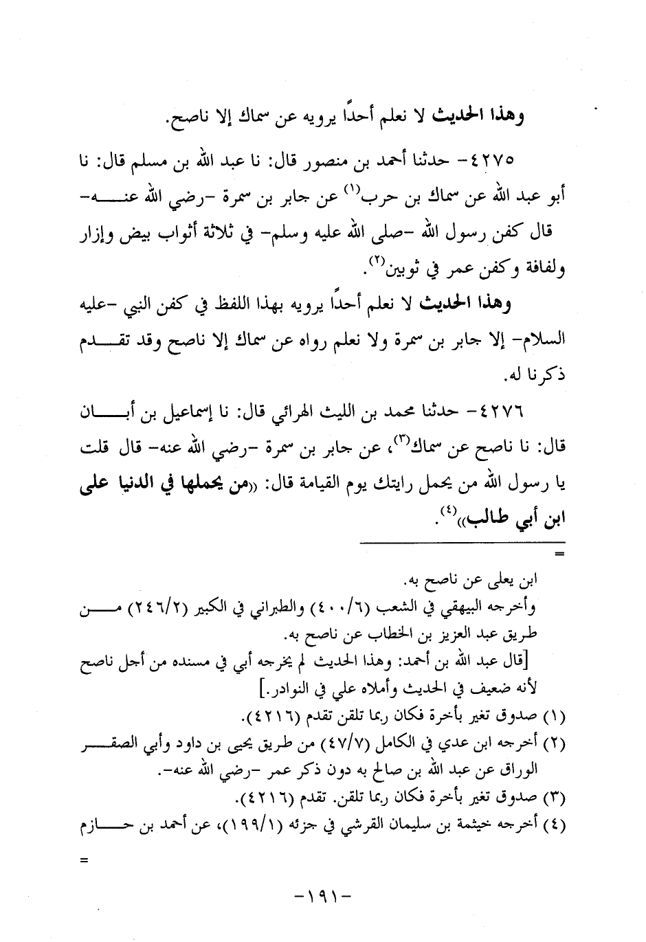4276- حَدَّثنا مُحَمد بن الليث الهرائي، قَال: حَدَّثنا إسماعيل بن أَبَان، قَال: حَدَّثنا نَاصِحٌ عَنْ سِمَاك عَنْ جَابِرِ بْنِ سَمُرة، رَضِي اللَّهُ عَنْهُ، قَالَ: قُلتُ يَا رَسولَ اللهِ مَنْ يَحْمِلُ رَايَتَكَ يَوْمَ الْقِيَامَةِ قَالَ: من يحملها في الدنيا عَلِيُّ بْنُ أَبِي طَالِبٍ.