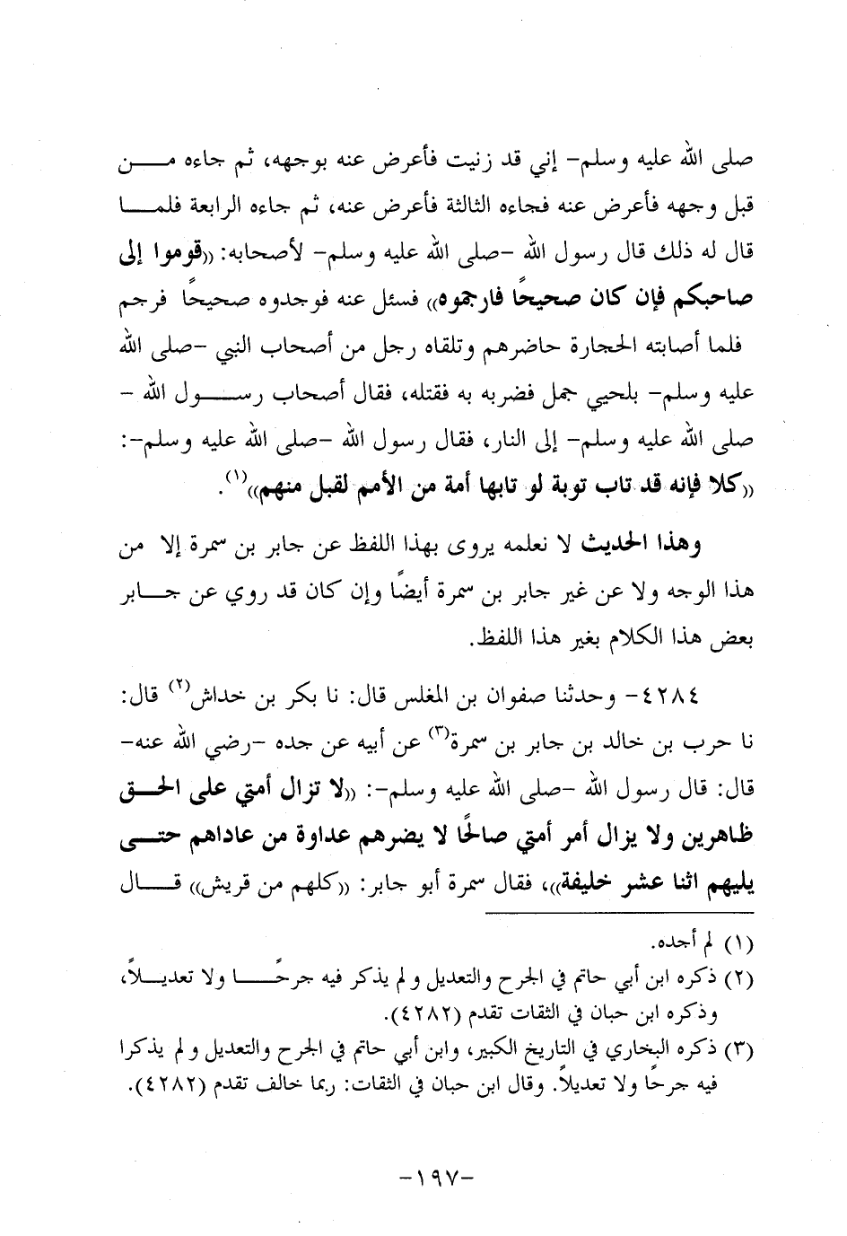4284- وحَدَّثنا صفوان بن المغلس، قَال: حَدَّثنا بكر بن خداش، قَال: حَدَّثنا حَرْبُ بْنُ خَالِدِ بْنِ جَابِرِ بْنِ سَمُرة، عَن أَبيهِ، عَن جَدِّه، رَضِي اللَّهُ عَنْهُ، قَالَ: قَالَ رَسُول اللهِ صَلَّى اللَّهُ عَلَيه وَسَلَّم: لا تَزَالُ أُمَّتِي عَلَى الْحَقِّ ظَاهِرِينَ، ولاَ يَزَالُ أَمْرُ أُمَّتِي صَالِحًا لا يَضُرُّهُمْ عَدَاوَةُ مَنْ عَادَاهُمْ حَتَّى يَلِيَهُمُ اثْنَا عَشَرَ خَلِيفَةً فَقَالَ سَمُرة أَبُو جَابِرٍ: كُلُّهُمْ مِنْ قُرَيْشٍ قَالَ نَعَمْ.