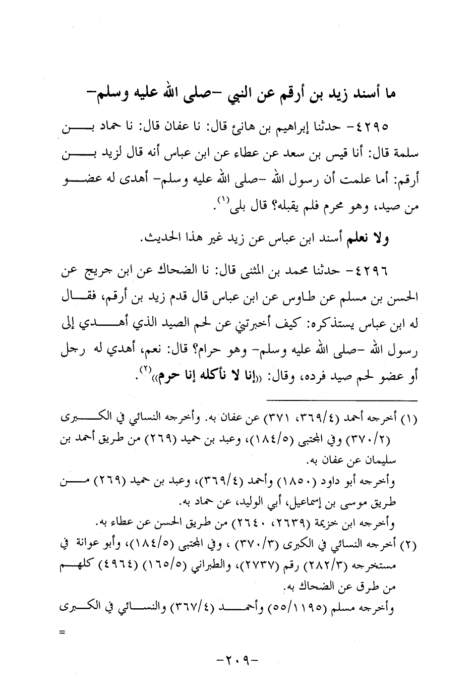 4295- حَدَّثنا إِبْرَاهِيمُ بْنُ هانيء، قَال: حَدَّثنا عفان، قَال: حَدَّثنا حماد بن سلمة، قال: أَخْبَرَنَا قَيْسُ بْنُ سَعْد، عَن عَطاء، عَن ابْنِ عَبَّاسٍ؛ أَنَّهُ قَالَ لِزَيْدِ بْنِ أَرْقَمَ: أَمَا عَلِمْتَ أَنَّ رَسُولَ اللهِ صَلَّى اللَّهُ عَلَيه وَسَلَّم أُهْدِيَ لَهُ عُضْوٌ مِنْ صَيْدٍ، وهُو مُحْرِمٌ فَلَمْ يَقْبَلْهُ؟ قَالَ بَلَى.