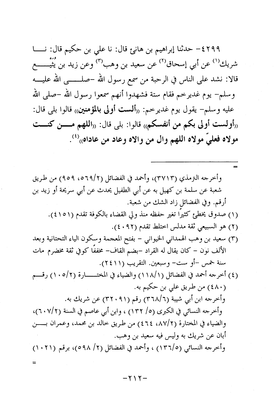 4299- حَدَّثنا إبراهيم بن هانيء، قَال: حَدَّثنا علي بن حكيم، قَال: حَدَّثنا شَرِيكٌ، عَن أَبِي إِسْحَاقَ، عَن سَعِيد بْنِ وَهْبٍ، وعَن زَيْدِ بْنِ يُثَيْعٍ قَالا: نَشُدُّ عَلَى النَّاسِ فِي الرَّحْبَةِ مَنْ سَمِعَ رَسُولَ الله صلى الله عيه وَسَلَّمَ يَوْمَ غَدِيرِ خُمٍّ فَقَامَ سِتَّةٌ فَشَهِدُوا أَنَّهُمْ سَمِعُوا رَسُولَ اللَّهِ صَلَّى اللَّهُ عَلَيه وَسَلَّم يَقُولُ يَوْمَ غَدِيرِ خُمٍّ: أَلَسْتُ أَوْلَى بِالْمُؤْمِنِينَ قَالُوا بَلَى قَالَ: أَوَلَسْتُ أَوْلَى بِكُمْ مِنْ أَنْفُسِكُمْ قَالُوا: بَلَى قَالَ: اللَّهُمَّ مَنْ كُنْتُ مَوْلاهُ فَعَلِيٌّ مَوْلاهُ اللَّهُمَّ وَالِ مَنْ وَالاهُ وَعَادِ مَنْ عَادَاهُ.