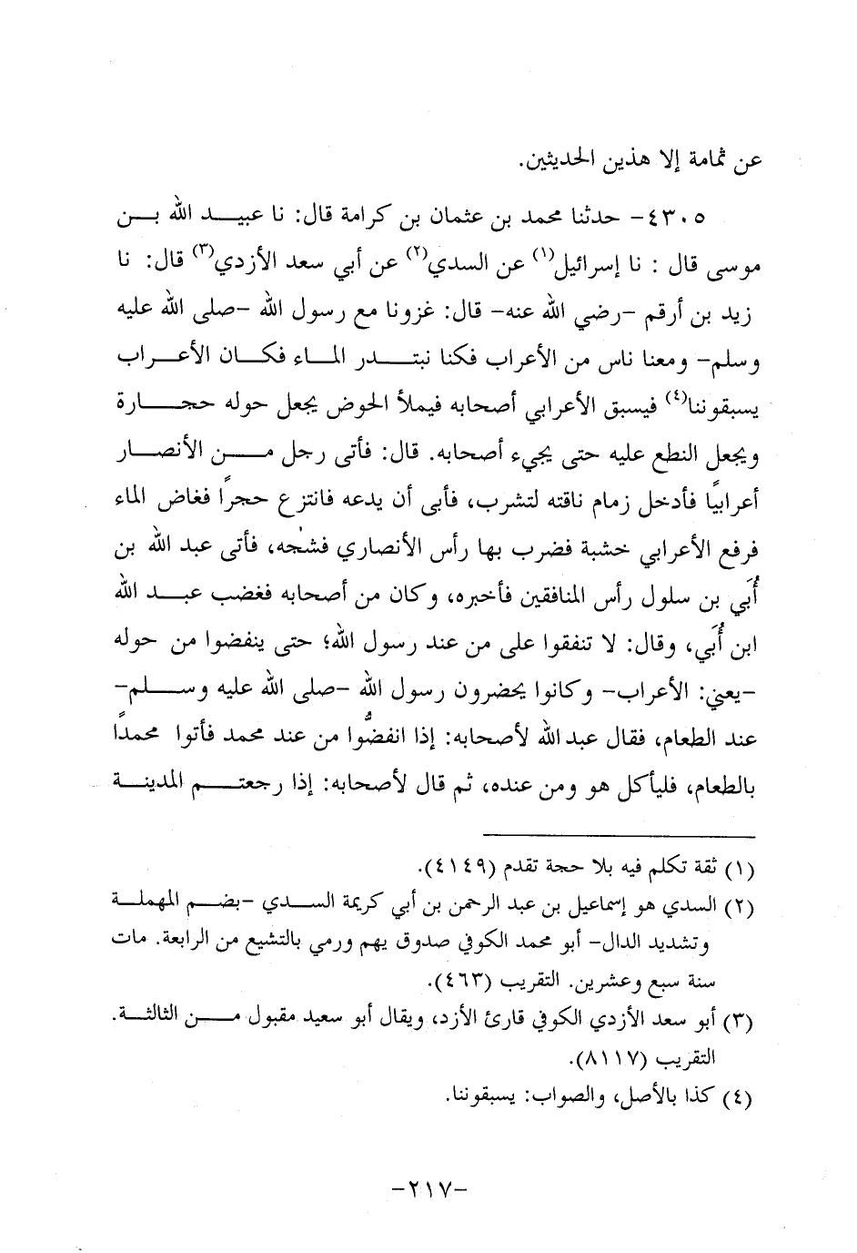 4305- حَدَّثنا مُحَمد بْنُ عُثمَان بْنِ كَرَامَةَ، قَال: حَدَّثنا عُبَيد الله بن موسى، قَال: حَدَّثنا إسرائيل، عَن السُّدِّي، عَن أبي سَعْد الأزدي، قَال: حَدَّثنا زَيْدَ بْنَ أَرْقَمَ، رَضِي اللَّهُ عَنْهُ، قَالَ: غَزَوْنَا مَعَ رَسُولِ اللَّهِ صَلَّى اللَّهُ عَلَيه وَسَلَّم وَمَعَنَا نَاسٌ مِنَ الأَعْرَابِ فَكُنَّا نَبْتَدِرُ الْمَاءَ فَكَانَ الأَعْرَابُ يَسْبِقُونَنَا فَيَسْبِقُ الأَعْرَابِيُّ أَصْحَابَهُ فَيَمْلأُ الْحَوْضَ يَجْعَلُ حَوْلَهُ حِجَارَةً وَيَجْعَلُ النِّطَعَ عَلَيْهِ حَتَّى يَجِيءَ أَصْحَابُهُ قَالَ: فَأَتَى رَجُلٌ مِنَ الأَنْصَارِ أَعْرَابِيًّا فَأَدْخَلَ زِمَامَ نَاقَتِهِ لِتَشْرَبَ فَأَبَى أَنْ يَدَعَهُ فَانْتَزَعَ حَجَرًا فَغَاضَ الْمَاءُ فَرَفَعَ الأَعْرَابِيُّ خَشَبَةً فَضَرَبَ بِهَا رَأْسَ الأَنْصَارِيِّ فشجه فأتى عَبد الله بن أبي بن سَلُولَ رَأْسَ الْمُنَافِقِينَ فَأَخْبَرَهُ، وَكان مِنْ أَصْحَابِهِ فَغَضِبَ عَبد اللَّهِ بْنُ أُبَيٍّ، وَقال: لا تُنْفِقُوا عَلَى مَنْ عِنْدَ رَسُولِ اللَّهِ حَتَّى يَنْفَضُّوا مِنْ حَوْلِهِ، يَعْنِي الأَعْرَابَ - وَكَانُوا يَحْضُرُونَ رَسُولَ اللَّهِ صَلَّى اللَّهُ عَلَيه وَسَلَّم عِنْدَ الطَّعَامِ فَقَالَ عَبد اللَّهِ لأَصْحَابِهِ: إِذَا انْفَضُّوا من عند مُحَمد فأتوا محمداً بطعام فَلْيَأْكُلْ هُوَ، وَمَنْ عِنْدَهُ، ثُمَّ قَالَ لأَصْحَابِهِ: إِذَا رَجَعْتُمُ الْمَدِينَةَ فَلَيُخْرِجَنَّ الأَعَزُّ مِنْكُمُ الأَذَلَّ قَالَ زَيْدٌ: وَأنا رِدْفُ عَمِّي فَسَمِعْتُ عَبد اللَّهِ بْنَ أُبَيٍّ وَكُنَّا أَخْوَالَهُ فَأَخْبَرْتُ عَمِّي فَانْطَلَقَ فَأَخْبَرَ رَسُولَ اللَّهِ صَلَّى اللَّهُ عَلَيه وَسَلَّم فَأَرْسَلَ رَسُولُ اللَّهِ صَلَّى اللَّهُ عَلَيه وَسَلَّم فحلق وَجَحَدَ فَصَدَّقَهُ وَكَذَّبَنِي فَجَاءَ إِلَى عَمِّي فَقَالَ مَا أَرَدْتُ أَنْ قَبِلَ رَسُولُ اللَّهِ صَلَّى اللَّهُ عَلَيه وَسَلَّم قَوْلَهُ وَكَذَّبَكَ وَكَذَّبَكَ الْمُسْلِمُونَ قَالَ: فَوَقَعَ عَلَيَّ مِنَ الْهَمِّ مَا لَمْ يَقَعْ عَلَى أَحَدٍ قَطُّ قَالَ: فَبَيْنَا أَنَا أَسِيرُ مَعَ رَسُولِ اللَّهِ صَلَّى اللَّهُ عَلَيه وَسَلَّم فِي سَفَرٍ فَأَخْفَقْتُ بِرَأْسِي مِنَ الْهَمِّ فَأَتَانِي رَسُولُ اللَّهِ صَلَّى اللَّهُ عَلَيه وَسَلَّم فَعَرَكَ أُذُنِي وَضَحِكَ فِي وَجْهِي فَمَا كَانَ يَسُرُّنِي أَنَّ لِيَ بِهَا الْمُلْكَ، أَوِ الدُّنْيَا، ثُمَّ إِنَّ أَبَا بَكْرٍ لَحِقَنِي فَقَالَ: مَا قَالَ لَكَ رَسُولُ اللَّهِ؟ قُلْتُ: مَا قَالَ لِي شَيْئًا إلاَّ أَنَّهُ عَرَكَ فِي أُذُنِي وَضَحِكَ فِي وَجْهِي فَقَالَ: أَبْشِرْ، ثُمَّ لَحِقَنِي عُمَر فَقَالَ لِي مِثْلَ قَوْلِ أَبِي بَكْر فَلَمَّا أَصْبَحْنَا قَرَأَ رَسُولُ اللَّهِ صَلَّى اللَّهُ عَلَيه وَسَلَّم سُورَةَ الْمُنَافِقِينَ.
