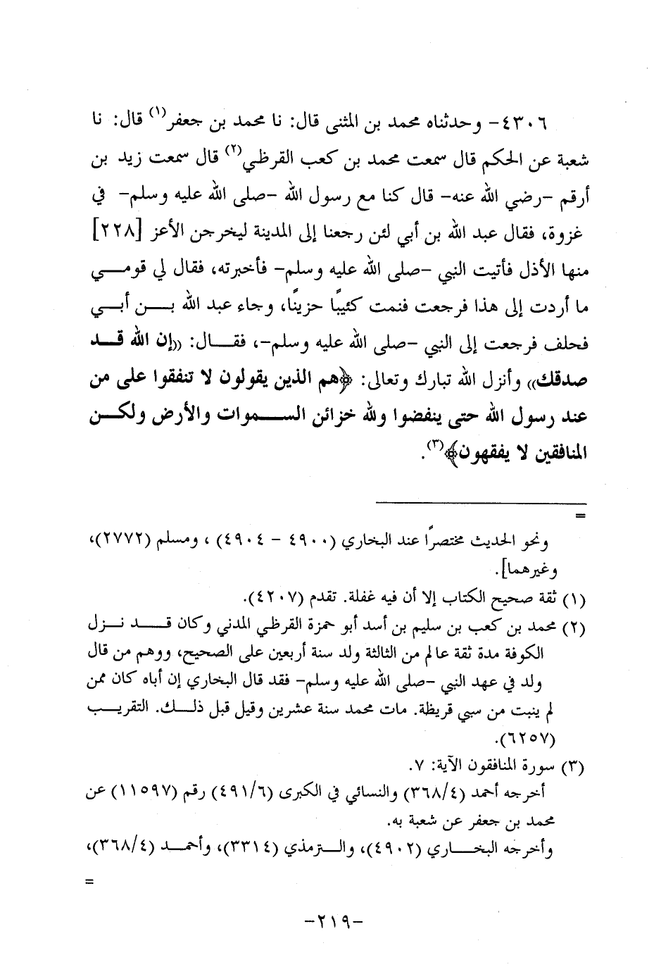 4306- وحَدَّثناه مُحَمد بن المثنى، قَال: حَدَّثنا مُحَمَّدُ بْنَ جَعْفَرٍ، قَال: حَدَّثنا شُعْبَةُ، عَن الْحَكَمِ، قَال: سَمعتُ مُحَمد بْنَ كَعْبٍ الْقُرَظِيَّ، قَال: سَمعتُ زَيْدَ بْنَ أَرْقَمَ، رَضِي اللَّهُ عَنْهُ، قَالَ كُنَّا مَعَ رَسُولِ اللَّهِ صَلَّى اللَّهُ عَلَيه وَسَلَّم فِي غَزْوَةٍ فَقَالَ عَبد اللَّهِ بْنُ أُبَيٍّ لَئِنْ رَجَعْنَا الْمَدِينَةِ لَيُخْرِجَنَّ الأَعَزُّ مِنْهَا الأَذَلَّ فَأَتَيْتُ النَّبِيّ صَلَّى اللَّهُ عَلَيه وَسَلَّم فَأَخْبَرْتُهُ فَقَالَ لِي قَوْمِي مَا أَرَدْتُ إِلَى هَذَا فَرَجَعْتُ فَنِمْتُ كئيباًحزيناً , وَجَاءَ عَبد اللَّهِ بْنُ أُبَيٍّ فَحَلَفَ فَرَجَعْتُ إِلَى النَّبِيّ صَلَّى اللَّهُ عَلَيه وَسَلَّم فَقَالَ: إِنَّ اللَّهَ قَدْ صَدَّقَكَ وَأَنْزَلَ اللَّهُ تَبَارَكَ وَتَعَالَى: {هُمُ الَّذِينَ يَقُولُونَ لاَ تُنفِقُوا عَلَى مَنْ عِندَ رَسُولِ اللَّهِ حَتَّى يَنفَضُّوا وَلِلَّهِ خَزَائِنُ السَّمَوَاتِ وَالأَرْضِ وَلَكِنَّ المُنَافِقِينَ لاَ يَفْقَهُونَ} .