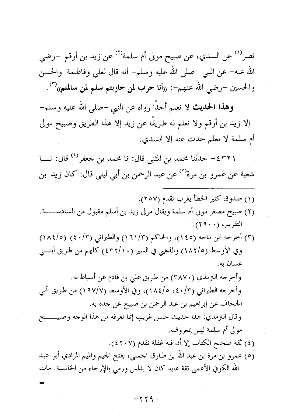4321- حَدَّثنا مُحَمَّدُ بْنَ الْمُثَنَّى، قَال: حَدَّثنا مُحَمَّدُ بْنَ جَعْفَرٍ، قَال: حَدَّثنا شُعْبَةُ، عَن عَمْرو بْنِ مُرَّةَ عَنْ عَبد الرَّحْمَنِ بْنِ أَبِي لَيْلَى قَالَ: كَانَ زَيْدُ بن أرقم يصلي على جنائزنا فيكبر يَوْمًا خَمْسًا فَسَأَلْنَاهُ عَنْ ذَلِكَ فَقَالَ: إِنَّ رَسُولَ اللَّهِ صَلَّى اللَّهُ عَلَيه وَسَلَّم كَبَّرَ خمسا.