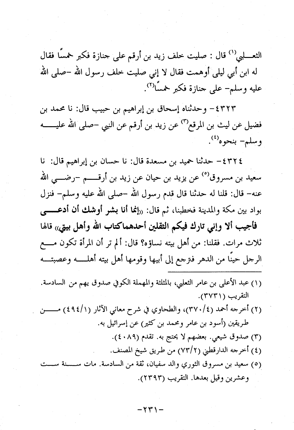 4314- حَدَّثنا حُمَيد بن مسعدة، قَال: حَدَّثنا حسان بن إبراهيم، قَال: حَدَّثنا سَعِيد بْنُ مَسْرُوقٍ عَنْ يَزِيدَ بْنِ حَيَّانَ، عَن زَيد بْنِ أَرْقَمَ، رَضِي اللَّهُ عَنْهُ، قَالَ: قُلْنَا لَهُ حَدَّثنا قَالَ قَدِمَ رَسُولُ اللَّهِ صَلَّى اللَّهُ عَلَيه وَسَلَّم فَنَزَلَ بِوَادٍ بَيْنَ مَكَّةَ وَالْمَدِينَةِ فَخَطَبَنَا، ثُمَّ قَالَ: إِنَّمَا أَنَا بَشَرٌ أُوشِكُ أَنْ أُدْعَى فَأُجِيبَ أَلا وَإِنِّي تَارِكٌ فِيكُمُ الثَّقَلَيْنِ أَحَدُهُمَا كِتَابُ اللَّهِ وَأَهْلُ بَيْتِي قَالَهَا ثَلاثَ مَرَّاتٍ. فَقُلْنَا: مِنْ أَهْلِ بَيْتِهِ نِسَاؤُهُ؟ قَالَ: أَلَمْ تَرَ أَنَّ الْمَرْأَةَ تَكُونُ مَعَ الرَّجُلِ حِينًا مِنَ الدَّهْرِ فَتَرْجِعُ إِلَى أَبِيهَا وَقَوْمِهَا أَهْلُ بَيْتِهِ أَهْلُهُ وَعَصَبَتُهُ الَّذِينَ حُرِمُوا الصَّدَقَةَ بَعْدَهُ آلُ عَبَّاسٍ وَآلُ عَلِيٍّ وَآلُ جَعْفَرٍ وَآلُ عَقِيلٍ.
