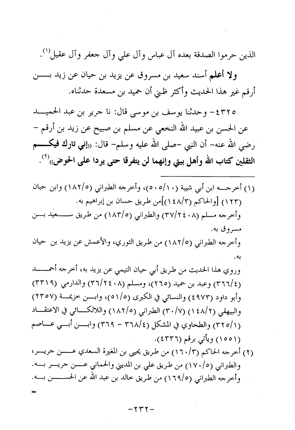 4325- وحَدَّثنا يوسف بن موسى، قَال: حَدَّثنا جَرِيرُ بْنُ عَبد الْحَمِيدِ عَنِ الْحَسَنِ بْنِ عُبَيد اللَّهِ النَّخَعِيِّ عَنْ مُسْلِمِ بْنِ صُبَيْحٍ، عَن زَيد بْنِ أَرْقَمَ، رَضِي اللَّهُ عَنْهُ، أَنَّ النَّبيَّ صَلَّى اللَّهُ عَلَيه وَسَلَّم قَالَ: إِنِّي تَارِكٌ فِيكُمُ الثَّقَلَيْنِ كِتَابَ اللَّهِ وَأَهْلَ بَيْتِي وَإِنَّهُمَا لَنْ يَتَفَرَّقَا حَتَّى يَرِدَا عَلَيَّ الحوض.