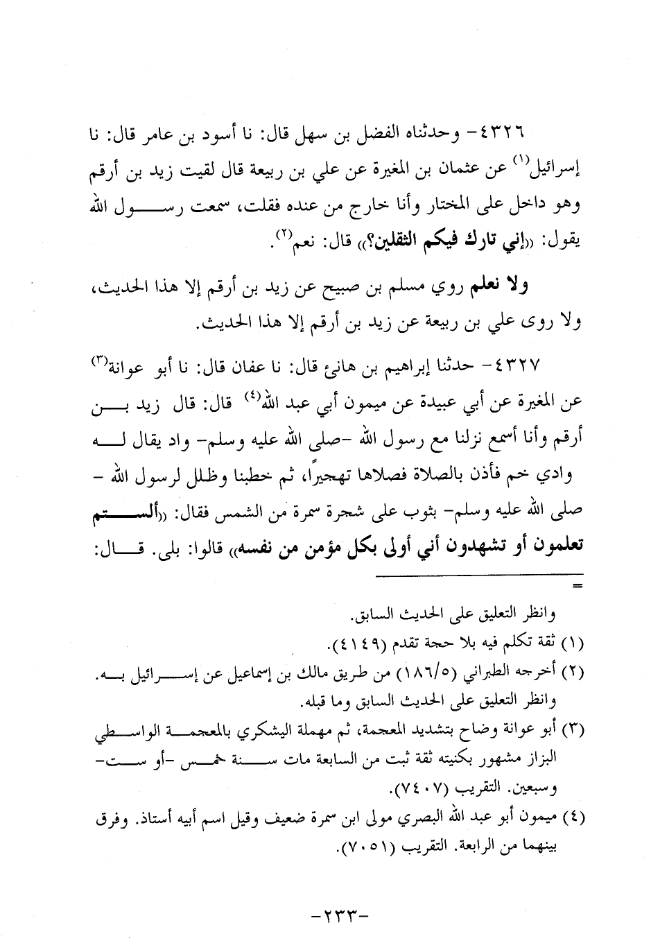 4326- وحَدَّثناه الفضل بن سَهْل، قَال: حَدَّثنا أسود بن عامر، قَال: حَدَّثنا إِسْرَائِيلُ، عَن عُثمَان بْنِ الْمُغِيرَةِ، عَنْ عَلِيِّ بْنِ رَبِيعَةَ قَالَ لَقِيتُ زَيْدَ بْنَ أَرْقَمَ، وهُو دَاخِلٌ عَلَى الْمُخْتَارِ، وَأنا خَارِجٌ مِنْ عنده فقلت سَمِعْتُ رَسُولَ اللَّهِ صَلَّى اللَّهُ عَلَيه وَسَلَّم يَقُولُ: إِنِّي تَارِكٌ فِيكُمُ الثَّقَلَيْنِ؟ قَالَ: نَعَمْ.