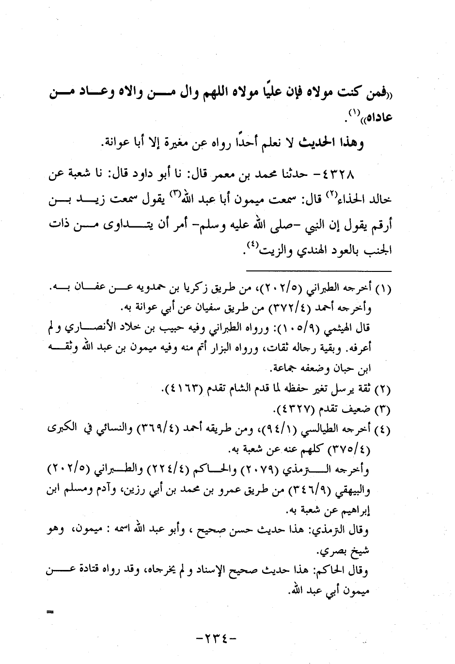 4328- حَدَّثنا مُحَمد بن مَعْمَر، قَال: حَدَّثنا أَبُو داود، قَال: حَدَّثنا شُعْبَةُ، عَن خالد الحَذَّاء، قَالَ: سَمِعْتُ ميمون أَبَا عَبد اللَّهِ يَقُولُ سَمِعْتُ زَيْدَ بْنَ أَرْقَمَ يَقُولُ إِنَّ النَّبِيّ صَلَّى اللَّهُ عَلَيه وَسَلَّم أَمَرَ أَنْ يُتَدَاوَى مِنْ ذَاتِ الْجَنْبِ بِالْعُودِ الْهِنْدِيِّ وَالزَّيْتِ.