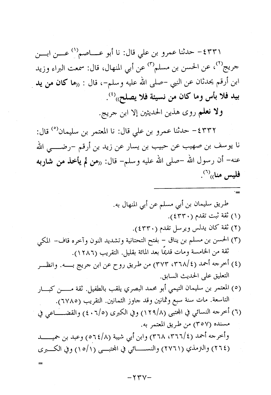 4332- حَدَّثنا عَمْرو بن علي، قَال: حَدَّثنا المعتمر بن سليمان، قَال: حَدَّثنا يُوسُفُ بْنُ صُهَيْبٍ عَن حَبيب بْنِ يَسَارٍ، عَن زَيد بْنِ أَرْقَمَ، رَضِي اللَّهُ عَنْهُ، أَنَّ رَسُولَ اللهِ صَلَّى اللَّهُ عَلَيه وَسَلَّم قَالَ: مَنْ لَمْ يَأْخُذْ مِنْ شَارِبِهِ فَلَيْسَ مِنَّا.