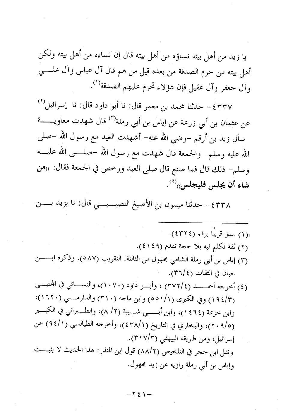 4337- حَدَّثنا مُحَمد بن مَعْمَر، قَال: حَدَّثنا أَبُو داود، قَال: حَدَّثنا إِسْرَائِيلُ، عَن عُثمَان بْنِ أَبِي زُرْعَةَ عَنْ إِيَاسِ بْنِ أَبِي رَمْلَةَ قَالَ شَهِدْتُ مُعَاوِيَةَ سَأَلَ زَيْدَ بْنَ أَرْقَمَ، رَضِي اللَّهُ عَنْهُ، أَشَهِدْتَ الْعِيدَ مَعَ رَسُولِ اللَّهِ صَلَّى اللَّهُ عَلَيه وَسَلَّم وَالْجُمُعَةَ قَالَ شَهِدْتُ مَعَ رَسُولِ اللَّهِ صَلَّى اللَّهُ عَلَيه وَسَلَّم ذَلِكَ قَالَ فَمَا صَنَعَ قَالَ صَلَّى الْعِيدَ وَرَخَّصَ فِي الْجُمُعَةِ فَقَالَ: مَنْ شَاءَ أَنْ يَجْلِسَ فَلْيَجْلِسْ.