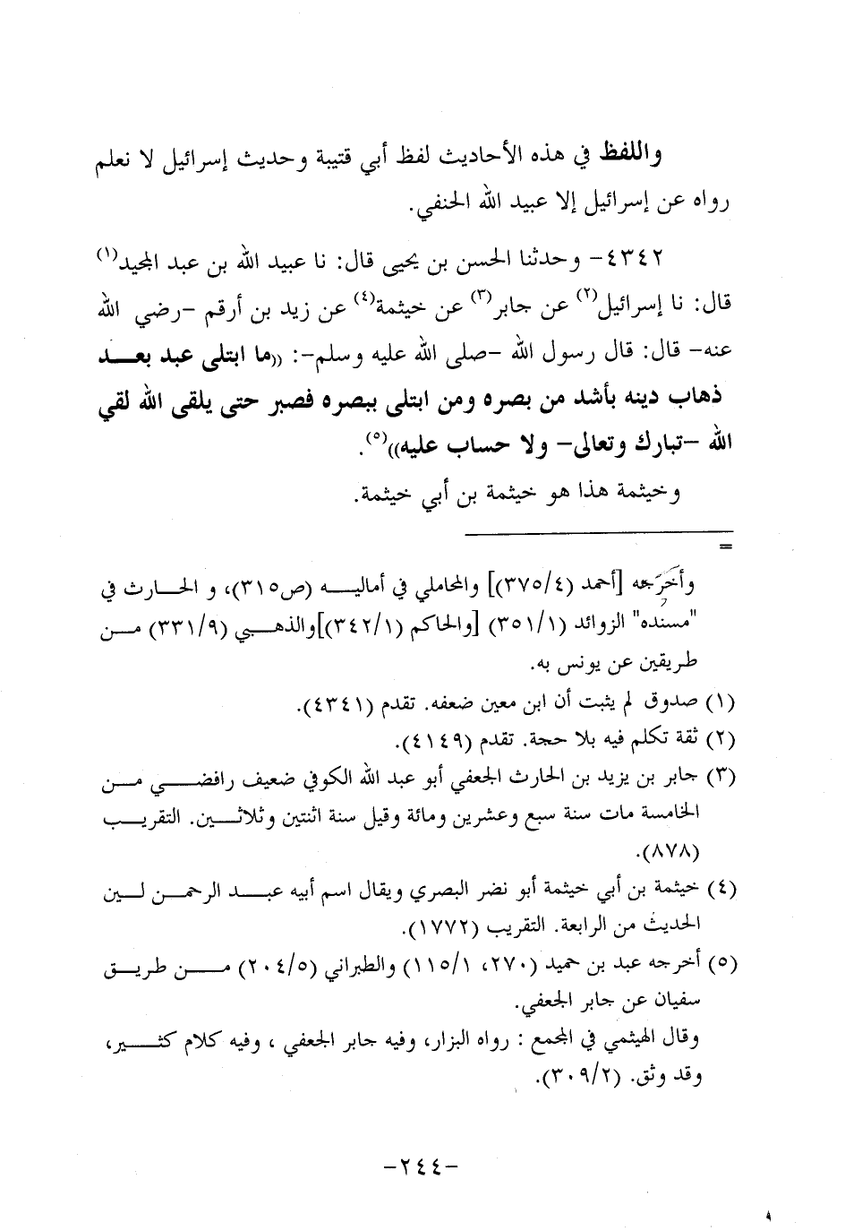4342- وحَدَّثنا الحسن بن يَحْيَى، قَال: حَدَّثنا عُبَيد الله بن عَبد المجيد، قَال: حَدَّثنا إِسْرَائِيلُ، عَن جَابِرٍ، عَنْ خَيْثَمَةَ، عَن زَيد بْنَ أَرْقَمَ، رَضِي اللَّهُ عَنْهُ، قَالَ: قَالَ رَسُول اللهِ صَلَّى اللَّهُ عَلَيه وَسَلَّم: مَا ابْتُلِيَ عَبد بَعْدَ ذَهَابِ دِينِهِ بِأَشَدَّ مِنْ بَصَرِهِ، وَمَنْ ابْتُلِيَ بِبَصَرِهِ فَصَبَرَ حَتَّى يَلْقَى اللَّهَ لَقِيَ اللَّهَ تَبَارَكَ وَتَعَالَى، ولاَ حِسَابَ عَلَيْهِ.