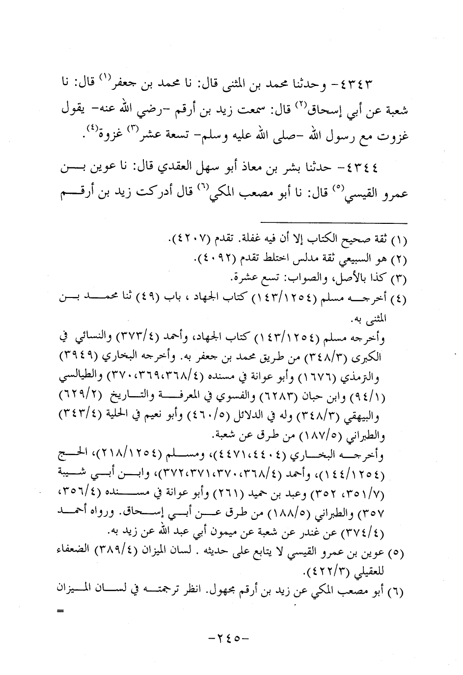 4343- وحَدَّثنا مُحَمَّدُ بْنَ الْمُثَنَّى، قَال: حَدَّثنا مُحَمَّدُ بْنَ جَعْفَرٍ قَالَ:نا شُعْبَةُ، عَن أَبِي إِسْحَاقَ، قَالَ: سَمِعْتُ زَيْدَ بْنَ أَرْقَمَ، رَضِي اللَّهُ عَنْهُ، يَقُولُ غَزَوْتُ مَعَ رسول الله صَلَّى الله عَلَيه وَسَلَّم تسعة عشر غزوة.