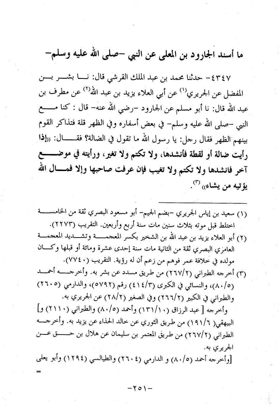 4347- حَدَّثنا مُحَمد بْنُ عَبد الملك القرشي، قَال: حَدَّثنا بِشْر بْنُ المُفَضَّل عَنِ الْجُرَيْرِيِّ، عَن أَبِي الْعَلاءِ يَزِيدَ بْنِ عَبد اللَّهِ، عَن مُطَرِّفِ بن عَبد الله، قَال: حَدَّثنا أَبُو مُسْلِمٍ، عَنِ الْجَارُودِ، رَضِي اللَّهُ عَنْهُ، قَالَ: كُنَّا مَعَ النَّبِيّ صَلَّى اللَّهُ عَلَيه وَسَلَّم فِي بَعْضِ أَسْفَارِهِ وَفِي الظُّهْرِ قِلَّةٌ فَتَذَاكَرَ الْقَوْمُ بَيْنَهُمُ الظُّهْرَ فَقَالَ رَجُلٌ: يَا رَسولَ اللهِ مَا تَقُولُ فِي الضَّالَّةِ؟ فَقَالَ: إِذَا رَأَيْتَ ضَالَّةً، أَو لُقَطَةً فَانْشُدْهَا، ولاَ تَكْتُمْ، ولاَ تُغَيِّرْ وَرَأَيْتُهُ فِي مَوْضِعٍ آخَرَ فَانْشُدْهَا، ولاَ تَكْتُمْ، ولاَ تُغَيِّبْ فَإِنْ عَرَفْتَ صَاحِبَهَا وَإِلا فَمَالُ اللَّهِ يُؤْتِيهِ مَنْ يَشَاءُ.