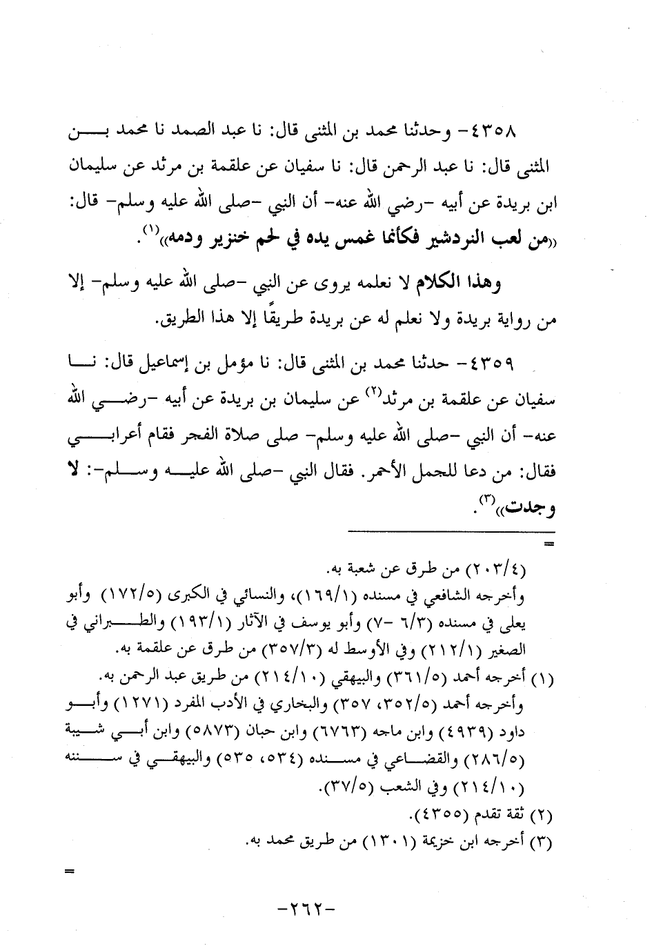 4358- وحَدَّثنا مُحَمَّدُ بْنَ الْمُثَنَّى، قَال: حَدَّثنا عَبد الصمد حَدَّثنا مُحَمَّدُ بْنَ الْمُثَنَّى، قَال: حَدَّثنا عَبد الرحمن، قَال: حَدَّثنا سُفيان، عَن عَلْقَمَةَ بْنِ مَرْثَدٍ، عَن سُلَيمان بْنِ بُرَيدة، عَن أَبيهِ، رَضِي اللَّهُ عَنْهُ، أَنَّ النَّبيَّ صَلَّى اللَّهُ عَلَيه وَسَلَّم قَالَ: مَنْ لَعِبَ النَّرْدَشِيرَ فَكَأَنَّمَا غَمَسَ يَدَهُ فِي لحم خِنْزِيرٍ وَدَمِهِ.