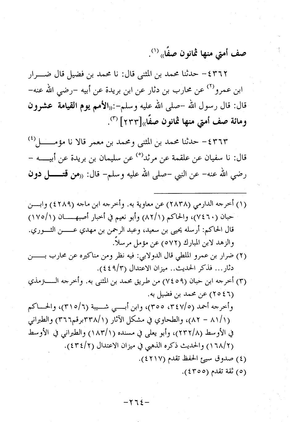 4362- حَدَّثنا مُحَمَّدُ بْنَ الْمُثَنَّى، قَال: حَدَّثنا مُحَمد بْنُ فُضَيْلٍ قَالَ ضِرَارُ بْنُ عَمْرو، عَن مُحَارِبِ بْنِ دِثَارٍ، عَن ابْنِ بُرَيدة، عَن أَبيهِ، رَضِي اللَّهُ عَنْهُ، قَالَ: قَالَ رَسُول اللهِ صَلَّى اللَّهُ عَلَيه وَسَلَّم: الأُمَمُ يوم القيامة عشرون ومِئَة صَفٍّ أُمَّتِي مِنْهَا ثَمَانُونَ صَفًّا.