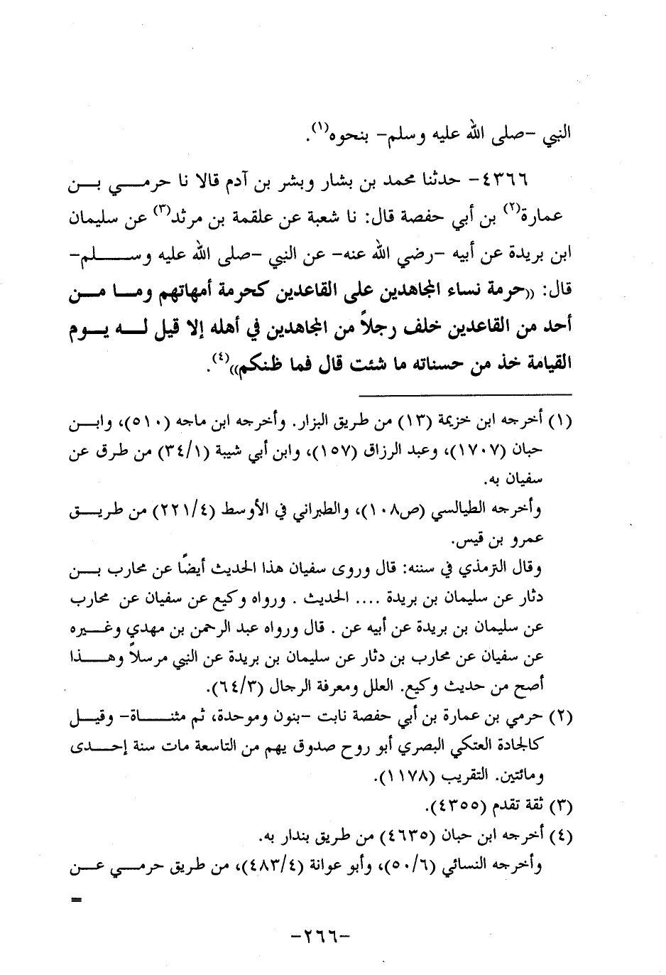 4366- حَدَّثنا مُحَمد بْنُ بَشَّار وَبِشْرُ بْنُ آدَمَ، قَالاَ: حَدَّثنَا حَرَمِيُّ بْنُ عُمَارَةَ بْنِ أَبِي حَفْصَةَ، قَال: حَدَّثنا شُعْبَةُ، عَن عَلْقَمَةَ بْنِ مَرْثَدٍ، عَن سُلَيمان بْنِ بُرَيدة، عَن أَبيهِ، رَضِي اللَّهُ عَنْهُ، عَنِ النَّبِيّ صَلَّى اللَّهُ عَلَيه وَسَلَّم قَالَ: حُرْمَةُ نِسَاءِ الْمُجَاهِدِينَ عَلَى الْقَاعِدِينَ كَحُرْمَةِ أُمَّهَاتِهِمْ وَمَا مِنْ أَحَدٍ مِنَ الْقَاعِدِينَ خَلَفَ رَجُلا من المجاهدين خَلَفَ رَجُلا مِنَ الْمُجَاهِدِينَ فِي أَهْلِهِ إلاَّ قِيلَ لَهُ يَوْمَ الْقِيَامَةِ خُذْ مِنْ حَسَنَاتِهِ مَا شِئْتَ قَالَ فَمَا ظَنُّكُمْ.