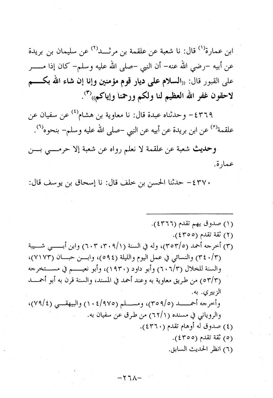 4370- حَدَّثنا الحسن بن خلف، قَال: حَدَّثنا إسحاق بن يوسف، قَال: حَدَّثنا سُفيان، عَن عَلْقَمَةَ بْنِ مَرْثَدٍ، عَن ابْنِ بُرَيدة، عَن أَبيهِ، رَضِي اللَّهُ عَنْهُ، أَنَّ رَجُلا سَأَلَ النَّبِيّ صَلَّى اللَّهُ عَلَيه وَسَلَّم عَنْ مَوَاقِيتِ الصَّلاةِ فَصَلَّى الظُّهْرَ حِينَ زَالَتِ الشَّمْسُ وَصَلَّى الْعَصْرَ حِينَ صَارَ ظِلُّ كُلٍّ شَيْءٍ مِثْلَهُ وَصَلَّى الْمَغْرِبَ حِينَ غَرَبَتِ الشَّمْسُ وَصَلَّى الْعِشَاءُ حِينَ غَابَ الشَّفَقُ وَصَلَّى الْفَجْرَ حِينَ طَلَعَ الْفَجْرُ وَصَلَّى الظُّهْرَ حَيْثُ صَارَ ظِلُّ كُلٍّ شَيْءٍ مِثْلَهُ وَالْعَصْرَ حِينَ صَارَ ظِلُّ كُلِّ شَيْءٍ مِثْلَيْهِ وَالْمَغْرِبَ حِينَ غَابَتِ الشَّمْسُ لِوَقْتِهَا بِالأَمْسِ وَالْعِشَاءَ بَعْدَ مَا أَعْتَمَ وَصَلَّى الْفَجْرَ حِينَ أَسْفَرَ، ثُمَّ قَالَ: أَيْنَ السَّائِلُ عَنْ مَوَاقِيتِ الصَّلاةِ مَا بَيْنَ هَذَيْنِ وقت.
