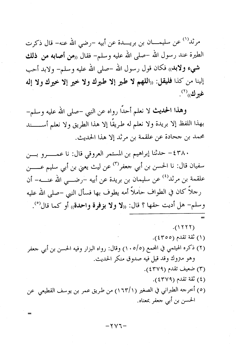 4380- حَدَّثنا إبراهيم بن المستمر العروقي، قَال: حَدَّثنا عَمْرو بن سُفيان، قَال: حَدَّثنا الْحَسَنُ بْنُ أَبِي جَعْفَرٍ عَنْ لَيْثٍ، يَعْنِي ابْنَ أَبِي سُلَيْمٍ عَنْ عَلْقَمَةَ بْنِ مَرْثَدٍ، عَن سُلَيمان بْنِ بُرَيدة، عَن أَبيهِ، رَضِي اللَّهُ عَنْهُ، أَنَّ رَجُلا كَانَ فِي الطَّوَافِ حَامِلا أُمَّهُ يَطُوفُ بِهَا فَسَأَلَ النَّبِيّ صَلَّى اللَّهُ عَلَيه وَسَلَّم هَلْ أَدَّيْتُ حَقَّهَا؟ قَالَ: لا، ولاَ بِزَفْرَةٍ وَاحِدَةٍ، أَوْ كَمَا قَالَ.