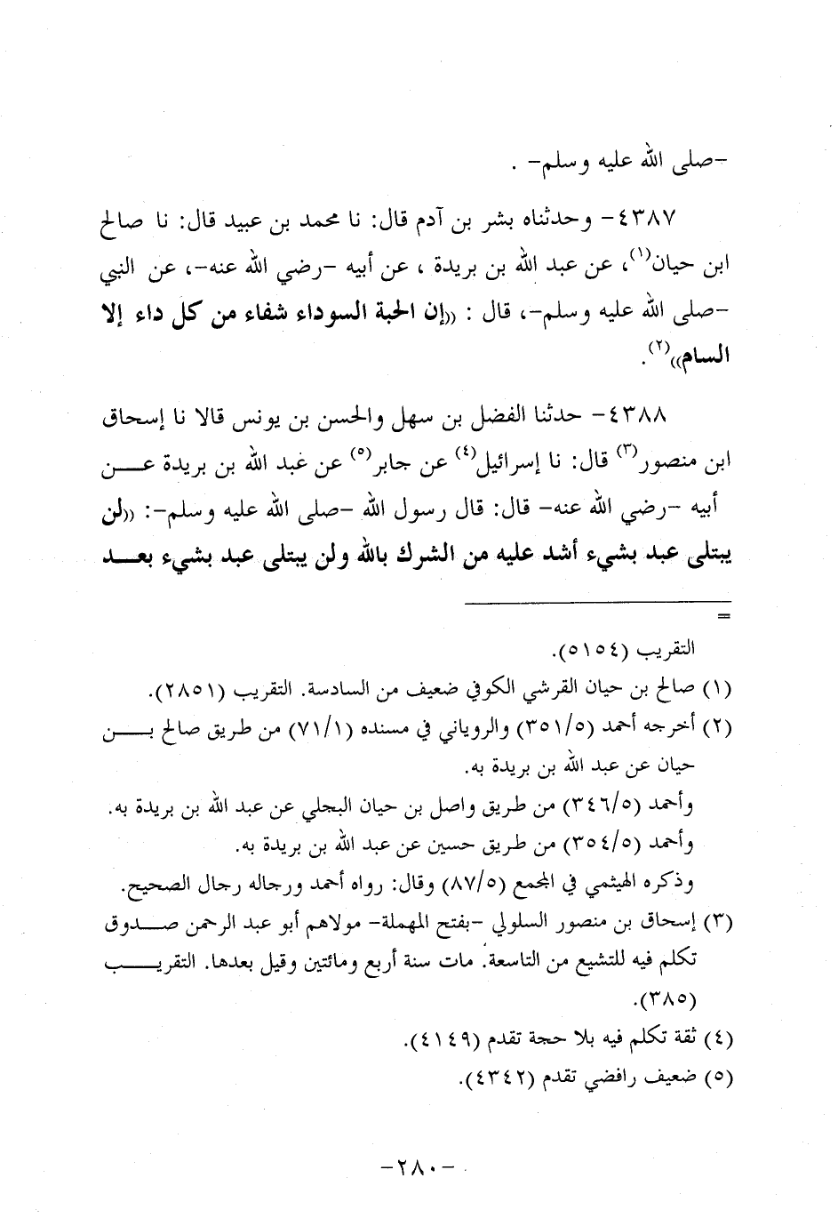 4387- وحَدَّثناه بِشْر بن آدم، قَال: حَدَّثنا مُحَمد بن عُبَيد، قَال: حَدَّثنا صالح بن حبان عَنْ عَبد اللَّهِ بْنِ بُرَيدة، عَن أَبيهِ، رَضِي اللَّهُ عَنْهُ، عَنِ النَّبِيّ صَلَّى اللَّهُ عَلَيه وَسَلَّم قَالَ: إِنَّ الْحَبَّةَ السَّوْدَاءَ شِفَاءٌ مِنْ كُلِّ دَاءٍ إلاَّ السَّامَ.