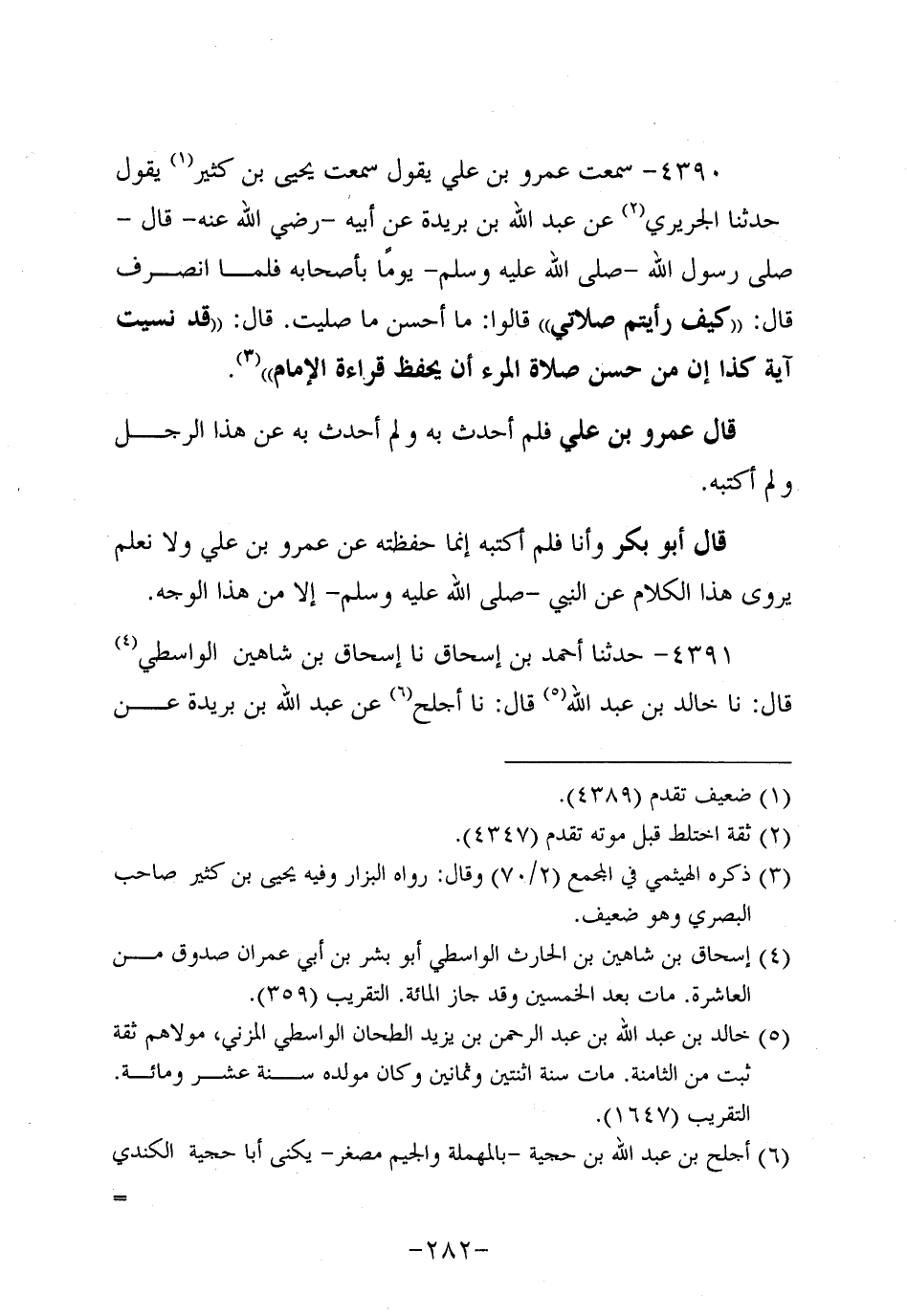 4390- سَمِعْتُ عَمْرو بْنَ عَلِيٍّ يَقُولُ سَمِعْتُ يَحْيَى بْنَ كَثِيرٍ يَقُولُ حَدَّثنا الْجُرَيْرِيُّ عَنْ عَبد اللَّهِ بْنِ بُرَيدة، عَن أَبيهِ، رَضِي اللَّهُ عَنْهُ، قَالَ صَلَّى رَسُولُ اللَّهِ صَلَّى اللَّهُ عَلَيه وَسَلَّم يَوْمًا بِأَصْحَابِهِ فَلَمَّا انْصَرَفَ قَالَ: كَيْفَ رَأَيْتُمْ صَلاتِي قَالُوا: مَا أَحْسَنَ مَا صَلَّيْتَ قَالَ: قَدْ نَسِيتُ آيَةَ كَذَا إِنَّ مِنْ حُسْنِ صَلاةِ الْمَرْءِ أَنْ يَحْفَظَ قِرَاءَةَ الإِمَامِ.