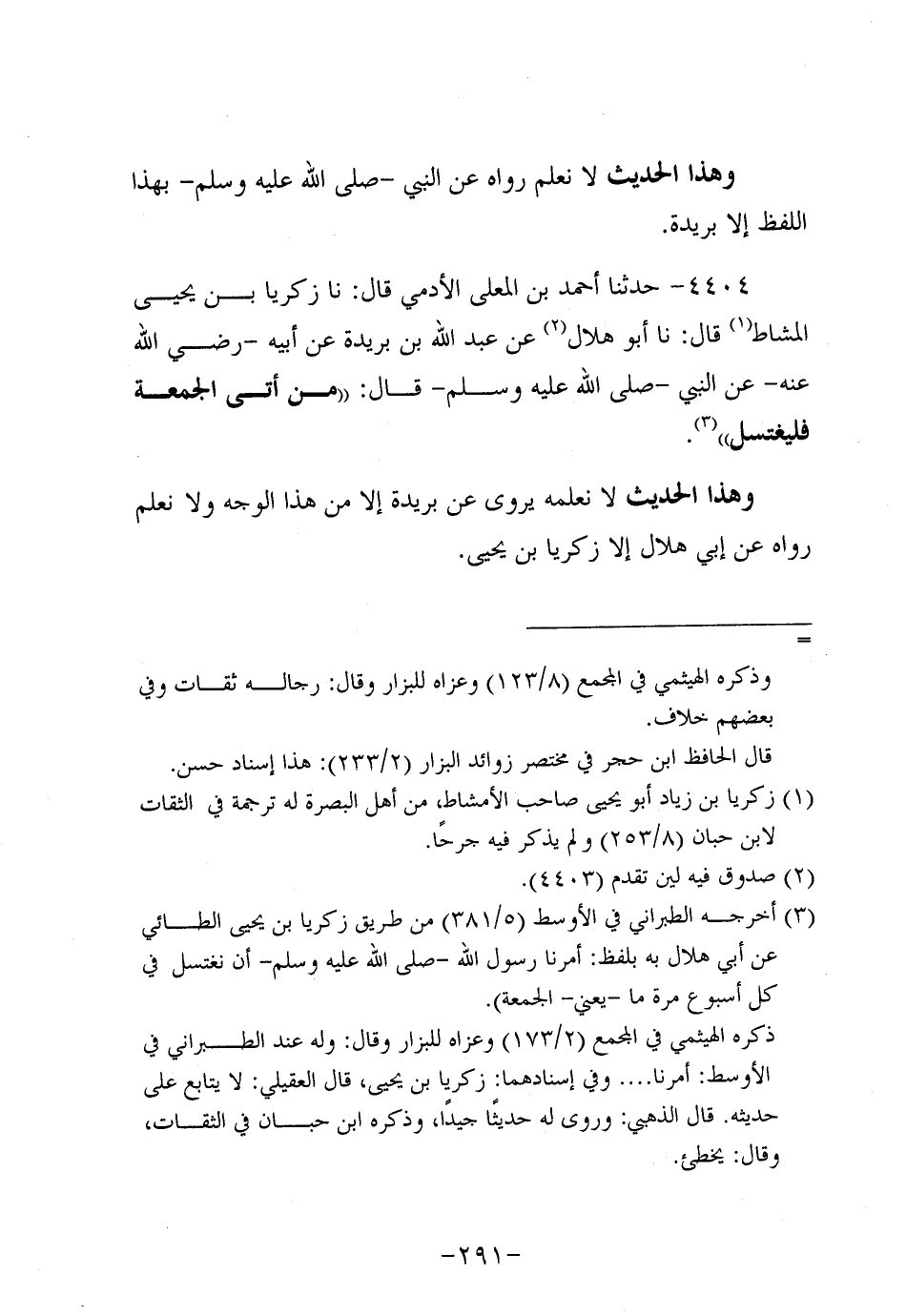 4404- حَدَّثنا أحمد بن المعلى الأدمي، قَال: حَدَّثنا زكريا بن يَحْيَى المشاط، قَال: حَدَّثنا أَبُو هِلالٍ عَنْ عَبد اللَّهِ بْنِ بُرَيدة، عَن أَبيهِ، رَضِي اللَّهُ عَنْهُ، عَنِ النَّبِيّ صَلَّى اللَّهُ عَلَيه وَسَلَّم قَالَ: مَنْ أَتَى الْجُمُعَةَ فَلْيَغْتَسِلْ.