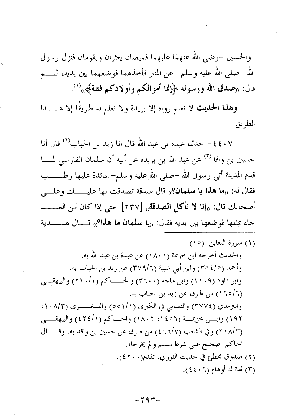 4407- حَدَّثنا عَبدة بن عَبد الله قال أَخْبَرَنَا زيد بن الحباب قال أَخْبَرَنَا حُسَيْنُ بْنُ وَاقِدٍ عَنْ عَبد اللَّهِ بْنِ بُرَيدة، عَن أَبيهِ أَنَّ سَلْمَانَ الْفَارِسِيَّ لَمَّا قَدِمَ الْمَدِينَةَ أَتَى رَسُولَ اللَّهِ صَلَّى اللَّهُ عَلَيه وَسَلَّم بِمَائِدَةٍ عَلَيْهَا رُطَبٌ فَقَالَ لَهُ: مَا هَذَا يَا سَلْمَانُ؟ قَالَ صَدَقَةٌ تَصَدَّقْتُ بِهَا عَلَيْكَ وَعَلَى أَصْحَابِكَ قَالَ: إِنَّا لا نَأْكُلُ الصَّدَقَةَ حَتَّى إِذَا كَانَ مِنَ الْغَدِ جَاءَ بِمِثْلِهَا فَوَضَعَهَا بَيْنَ يَدَيْهِ فَقَالَ: يَا سَلْمَانُ مَا هَذَا؟ قَالَ هَدِيَّةٌ فَقَالَ كُلُوا وَأَكَلَ وَنَظَرَ إِلَى الْخَاتَمِ فِي ظَهْرِهِ قَالَ وَاشْتَرَاهُ رَسُولُ اللَّهِ صَلَّى اللَّهُ عَلَيه وَسَلَّم بِكَذَا وَكَذَا دِرْهَمًا مِنْ قَوْمٍ مِنَ الْيَهُودِ وَعَلَى أَنْ يَغْرِسَ لَهُمْ كَذَا وَكَذَا مِنَ النَّخِيلِ وَيَعْمَلَ حَتَّى يُطْعَمَ قَالَ فَغَرَسَ رَسُولُ الله صَلَّى الله عَلَيه وَسَلَّم النخل إلاَّ نخلة واحده غرسها غيره فأطعن النَّخْلُ مِنْ عَامِهِ إلاَّ النَّخْلَةَ الَّتِي غَرَسَهَا غَيْرُهُ فَقَالَ رَسُولُ اللَّهِ صَلَّى اللَّهُ عَلَيه وَسَلَّم: مَنْ غَرَسَهَا؟ فَقَالُوا فُلانٌ فَقَلَعَهَا وَغَرَسَهَا رَسُولُ اللَّهِ صَلَّى اللَّهُ عَلَيه وَسَلَّم فَأُطْعِمَتْ مِنْ عَامِهَا.
