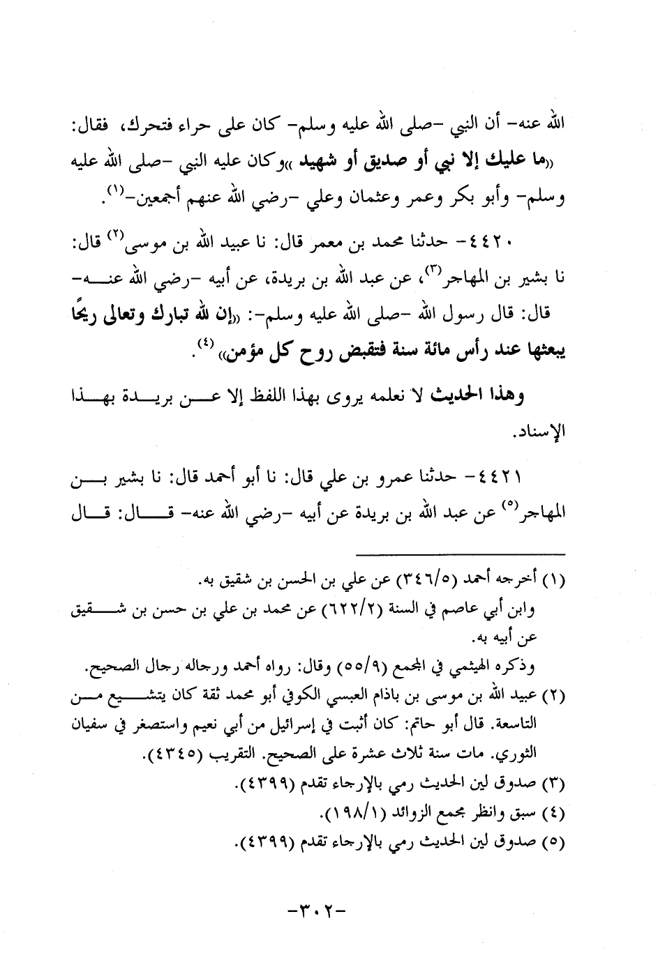 4420- حَدَّثنا مُحَمد بن مَعْمَر، قَال: حَدَّثنا عُبَيد الله بن موسى، قَال: حَدَّثنا بَشِيرُ بْنُ الْمُهَاجِرِ عَنْ عَبد اللَّهِ بْنِ بُرَيدة، عَن أَبيهِ، رَضِي اللَّهُ عَنْهُ، قَالَ: قَالَ رَسُول اللهِ صَلَّى اللَّهُ عَلَيه وَسَلَّم: إِنَّ لِلَّهِ تَبَارَكَ وَتَعَالَى رِيحًا يَبْعَثُهَا عِنْدَ رأس مِئَة سَنَةٍ فَتَقْبِضُ رُوحَ كُلِّ مُؤْمِنٍ.